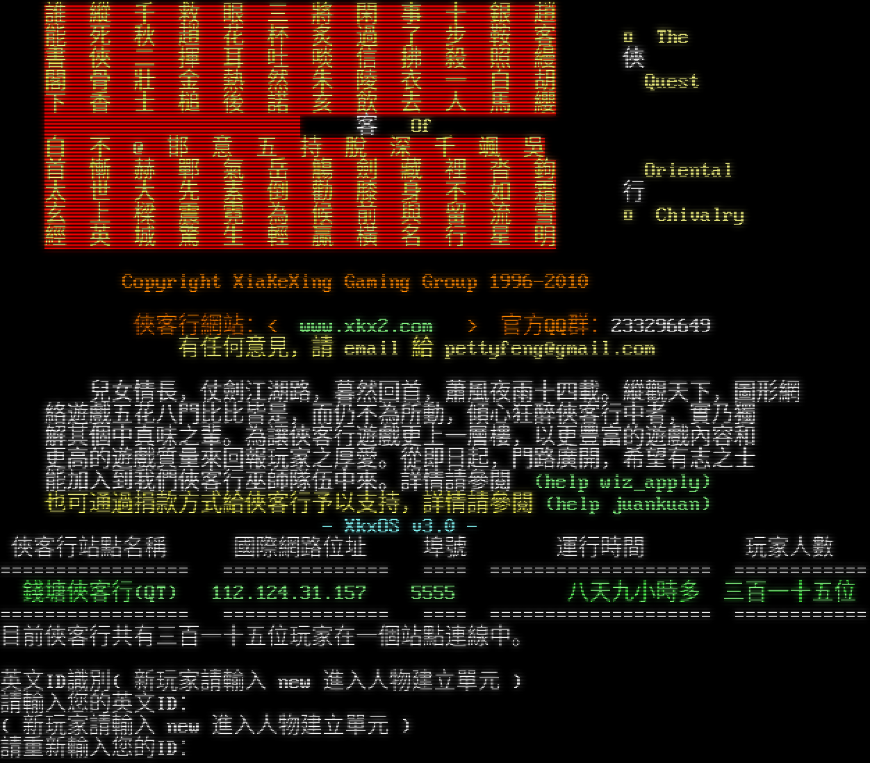 Welcome to chinese MUD XiaKeXing. Are you using BIG5 code?(Yes\|No) > Ok, use BIG5 code。 誰 縱 千 救 眼 三 將 閑 事 十 銀 趙 能 死 秋 趙 花 杯 炙 過 了 步 鞍 客 □ The 書 俠 二 揮 耳 吐 啖 信 拂 殺 照 縵 俠 閣 骨 壯 金 熱 然 朱 陵 衣 一 白 胡 Quest 下 香 士 槌 後 諾 亥 飲 去 人 馬 纓 客 Of 白 不 @ 邯 意 五 持 脫 深 千 颯 吳 首 慚 赫 鄲 氣 岳 觴 劍 藏 裡 沓 鉤 Oriental 太 世 大 先 素 倒 勸 膝 身 不 如 霜 行 玄 上 樑 震 霓 為 候 前 與 留 流 雪 □ Chivalry 經 英 城 驚 生 輕 贏 橫 名 行 星 明 Copyright XiaKeXing Gaming Group 1996-2010 俠客行網站:< www.xkx2.com > 官方QQ群:233296649 有任何意見,請 email 給 pettyfeng@gmail.com 兒女情長,仗劍江湖路,暮然回首,蕭風夜雨十四載。縱觀天下,圖形網 絡遊戲五花八門比比皆是,而仍不為所動,傾心狂醉俠客行中者,實乃獨 解其個中真味之輩。為讓俠客行遊戲更上一層樓,以更豐富的遊戲內容和 更高的遊戲質量來回報玩家之厚愛。從即日起,門路廣開,希望有志之士 能加入到我們俠客行巫師隊伍中來。詳情請參閱 (help wiz_apply) 也可通過捐款方式給俠客行予以支持,詳情請參閱 (help juankuan) - XkxOS v3.0 - 俠客行站點名稱 國際網路位址 埠號 運行時間 玩家人數 =​================ =​============== =​=== =​=================== =​=========== 錢塘俠客行(QT) 112.124.31.157 5555 八天九小時多 三百一十五位 =​================ =​============== =​=== =​=================== =​=========== 目前俠客行共有三百一十五位玩家在一個站點連線中。 英文ID識別( 新玩家請輸入 new 進入人物建立單元 ) 請輸入您的英文ID: ( 新玩家請輸入 new 進入人物建立單元 ) 請重新輸入您的ID: