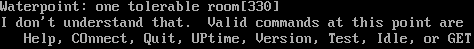 Waterpoint: one tolerable room[330] I don't understand that. Valid commands at this point are Help, COnnect, Quit, UPtime, Version, Test, Idle, or GET