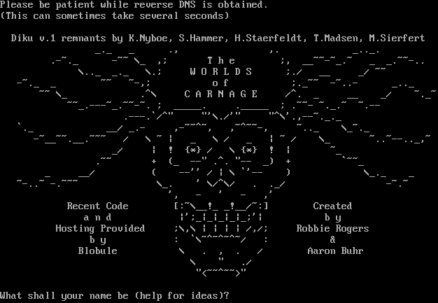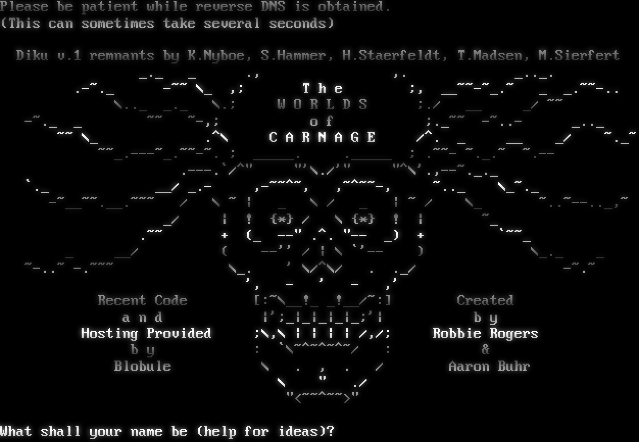 Please be patient while reverse DNS is obtained. (This can sometimes take several seconds) Diku v.1 remnants by K.Nyboe, S.Hammer, H.Staerfeldt, T.Madsen, M.Sierfert _._ _ ., ,. _​.._. .​-~._ -~~ \\_ ,; T h e ;, _​_~~-~_.~ _ _​.~~-.. \\.._ _._ \\.; W O R L D S ;./ __ _/ ~~ -​~._ _ ~~ ~-,; o f ;.​_~~ -​~..- _​.._ ~~ \\_ .^\\ C A R N A G E /^. _ __ _/ ~​._~ ~​~_.---~_.~~-~. ; _​____. .​_____ ; .​~~- ~​._.~ ~​.-- .​---.\`/^" "'\\./'" "^\\'.,-​-~._._ \`._ __/ _.- ,-​~~^~, ,~​^~~-, ~​.._ \\_​~._ -​~__~~.__.~~~ / \\ ~ \| _ \\ / _ \| ~ / \\_ ~​..~--.._,~ _/ \| ! {\*} / \\ {\*} ! \| ~_ .~~ + (_ --" .^. "-- _) + \`~~_ _ __/ ( --'' / \| \\ \`'-- ) \\_._ _ ~​-..~ -​.~~~ \\_. ' \\/^\\/ . ._/ -​~.~ ', - ' - ,' Recent Code [:~\\__!_ _!__/~:] Created a n d \|';_\|_\|_\|_\|_;'\| b y Hosting Provided ;\\,\\ \| \| \| \| /,/; Robbie Rogers b y : \`\\~​^~^~^~/ : & Blobule \\ . , . / Aaron Buhr \\ " ./ "<~​~^~~>" What shall your name be (help for ideas)?