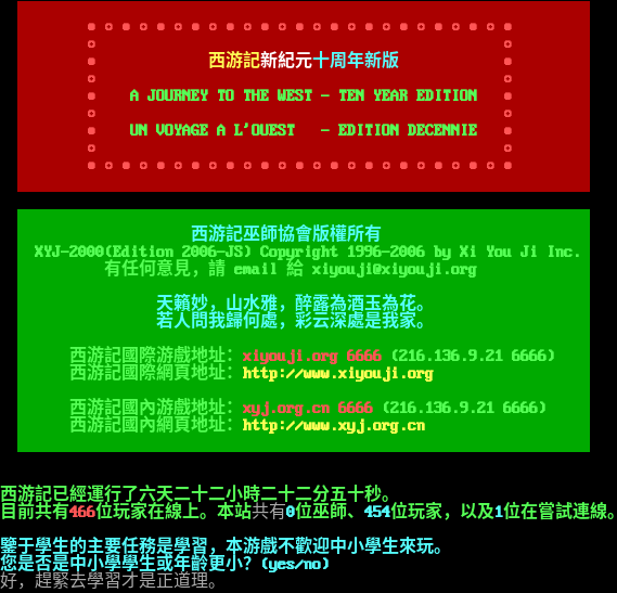 @ @ @ @ @ @ @ @@ @@ @@ @@@@@@@@ @@@@@@@@@@@@@@@ @@ @ @@@@@ @@ @@ @@ @@ @ @@@@@@@ @ @@ @@ @@ @@ @ @ @ @@ @ @@ @@ @ @ @ @ @@@@@ @@@@@ @@ @@@@@@@@@@@@@@ @@ @ @ @ @@ @@ @@@@@@@ @@ @@ @@ @@ @ @ @@@@@ @@ @@ @@ @ @@ @@ @@ @@ @ @ @@ @ @@ @@ @@ @@ @@@@@@ @ @ @@ @@ @@ @@ @@ @@ @@@@@ @@@ @ @@@@@@@@ @@ @@ @@@ @@ @@ @ @@ @@ @@ @@@ @@ @@ @@ @@ @@ @@ @@@ @@ @ @@@@@@@@@@@@@ @@ @ @@ @@ @@@ @@ @ @@ @@ @@ @ @@@ @@@ @ @@@@@@@@@ @ @ @ @ @ @ @@@@@@@ 昹蚔暮辣茩蠟懂溼ㄐ妏蚚弊梓鎢腔俙模③瑩諴gb 西游記歡迎您來訪!使用大五碼的玩家請鍵入:big5 [If there is no response after ENTER, please try Ctrl-ENTER] [枑尨ㄩ蝜偌ENTER瑩綴炵苀羶衄砒茼ㄛ③彸 Ctrl-ENTER] Welcome to Xi You Ji! Select GB or BIG5 (gb/big5): ●○●○●○●○●○●○●○●○●○●○●○●○● ○ ○ ● 西游記新紀元十周年新版 ● ○ ○ ● A JOURNEY TO THE WEST - TEN YEAR EDITION ● ○ ○ ● UN VOYAGE A L'OUEST - EDITION DECENNIE ● ○ ○ ●○●○●○●○●○●○●○●○●○●○●○●○● 西游記巫師協會版權所有 XYJ-2000(Edition 2006-JS) Copyright 1996-2006 by Xi You Ji Inc. 有任何意見,請 email 給 xiyouji@xiyouji.org 天籟妙,山水雅,醉露為酒玉為花。 若人問我歸何處,彩云深處是我家。 西游記國際游戲地址:xiyouji.org 6666 (216.136.9.21 6666) 西游記國際網頁地址:http://www.xiyouji.org 西游記國內游戲地址:xyj.org.cn 6666 (216.136.9.21 6666) 西游記國內網頁地址:http://www.xyj.org.cn 西游記已經運行了六天二十二小時二十二分五十秒。 目前共有466位玩家在線上。本站共有0位巫師、454位玩家,以及1位在嘗試連線。 鑒于學生的主要任務是學習,本游戲不歡迎中小學生來玩。 您是否是中小學學生或年齡更小?(yes/no) 好,趕緊去學習才是正道理。