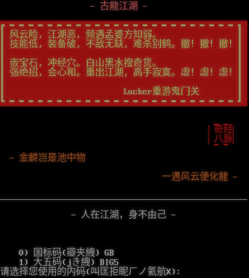 - 古龍江湖 - ┏━━━━━━━━━━━━━━━━━━━━━━━━┓ ┃风云险,江湖恶,频遇孟婆方知弱。 ┃ ┃技能低,装备破,不敌无缺,难杀别鹤。撤!撤!撤!┃ ┃ ┃ ┃嵌宝石,冲经穴。白山黑水搜奇货。 ┃ ┃强绝招,会心和。重出江湖,高手寂寞。虐!虐!虐!┃ ┃ ┃ ┃ Lucker重游鬼门关 ┃ ┗━━━━━━━━━━━━━━━━━━━━━━━━┛ ▁▁ ▕奇经▏ ▕八脉▏ ▔▔ - 金麟岂是池中物 一遇风云便化龍 - _​___________________________________________________ - 人在江湖,身不由己 - 0) 国标码(瓣夹絏) GB 1) 大五码(jき絏) BIG5 请选择您使用的内码(叫匡拒眤ㄏノ氦航X):