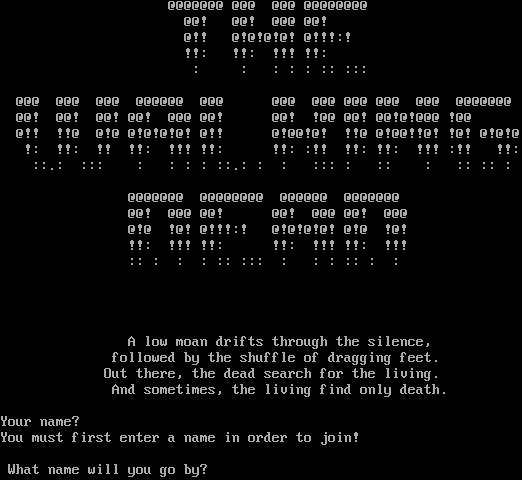 @@@@@@@ @@@ @@@ @@@@@@@@ @@! @@! @@@ @@! @!! @!@!@!@! @!!!:! !!: !!: !!! !!: : : : : : :: ::: @@@ @@@ @@@ @@@@@@ @@@ @@@ @@@ @@@ @@@ @@@ @@@@@@@ @@! @@! @@! @@! @@@ @@! @@! !@@ @@! @@!@!@@@ !@@ @!! !!@ @!@ @!@!@!@! @!! @!@@!@! !!@ @!@@!!@! !@! @!@!@ !: !!: !! !!: !!! !!: !!: :!! !!: !!: !!! :!! !!: ::.: ::: : : : : ::.: : : ::: : :: : :: :: : @@@@@@@ @@@@@@@@ @@@@@@ @@@@@@@ @@! @@@ @@! @@! @@@ @@! @@@ @!@ !@! @!!!:! @!@!@!@! @!@ !@! !!: !!! !!: !!: !!! !!: !!! :: : : : :: ::: : : : :: : : A low moan drifts through the silence, followed by the shuffle of dragging feet. Out there, the dead search for the living. And sometimes, the living find only death. Your name? You must first enter a name in order to join! What name will you go by?