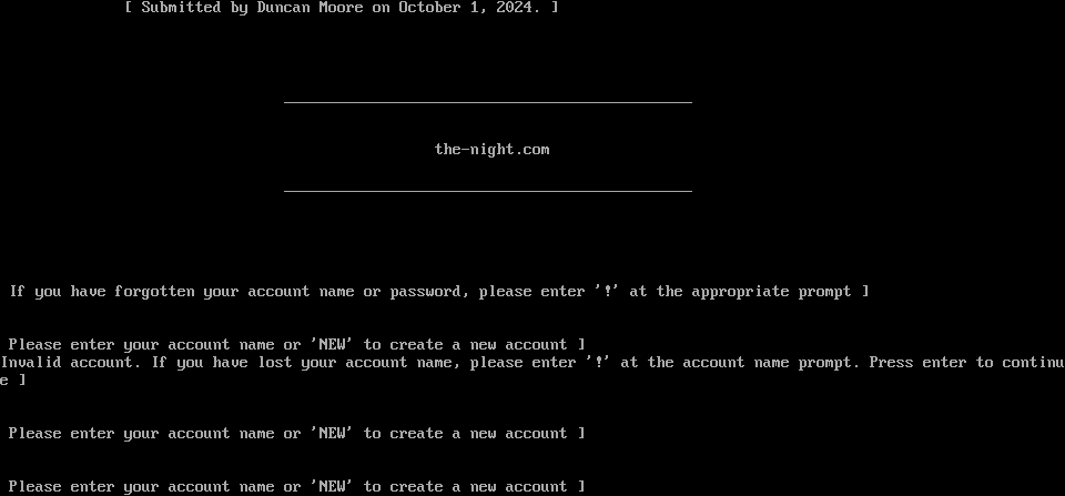 . [ TNC Pots #71 ] \* Rochelle Overton takes up an orthodox stance while Tawanda Mizell takes up a southpaw stance. The announcer shouts, "FIGHT!" You fight the urge to cover your ears as Jess Moore yells, "TAWANDA FOREVER" Duncan Moore sighs. Jess Moore beams at Duncan Moore. [ Submitted by Duncan Moore on October 1, 2024. ] _​_____________________________________________ the-night.com _​_____________________________________________ If you have forgotten your account name or password, please enter '!' at the appropriate prompt ] Please enter your account name or 'NEW' to create a new account ] Invalid account. If you have lost your account name, please enter '!' at the account name prompt. Press enter to continue ] Please enter your account name or 'NEW' to create a new account ] Please enter your account name or 'NEW' to create a new account ]