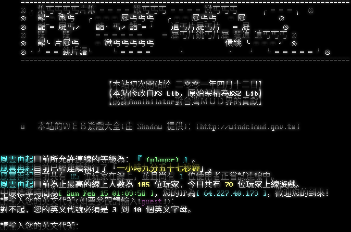 =​============================================================================== ◎╭煍丐丐丐丐片煍 ════煍丐丐丐 ════煍丐丐丐 ╭═══╮ ◎ ◎ 齰~═煍丐 ╭═══屣丐丐丐 ╭══屣丐丐 ═屣 ◎ ◎ 齰~═屣丐↗ 齰╰丐↗齰~═╯ 遉丐片屣丐片 ═屣 ◎ ◎ 矙 矙 ══════ ═屣丐片銚丐片屣 矙遉 遉丐丐丐 ◎ ◎ 齰╰片屣丐 ═煍丐丐丐丐丐 僓銚 ╰═══╯ ◎ ◎╰╯══銚片潳╰ ╰════ ╰ ╯ ╯ ╰═════╯◎ =​============================================================================== 【本站初次開站於 二零零一年四月十二日】 【本站修改自FS Lib,原始架構為ES2 Lib】 【感謝Annihilator對台灣MUD界的貢獻】 □ 本站的WEB遊戲大全(由 Shadow 提供):[http://windcloud.qov.tw] 風雲再起目前所允許連線的等級為:『 (player) 』。 風雲再起目前已經連續執行了「一小時九分五十七秒鐘」。 風雲再起目前共有 85 位玩家在線上,並且尚有 1 位使用者正嘗試連線中。 風雲再起目前為止最高的線上人數為 185 位玩家,今日共有 70 位玩家上線遊戲。 中原標準時間為[ Sun Feb 15 01:09:58 ],您的IP為[ 64.227.40.173 ],歡迎您的到來! 請輸入您的英文代號(如要參觀請輸入[guest]): 對不起,您的英文代號必須是 3 到 10 個英文字母。 請輸入您的英文代號:
