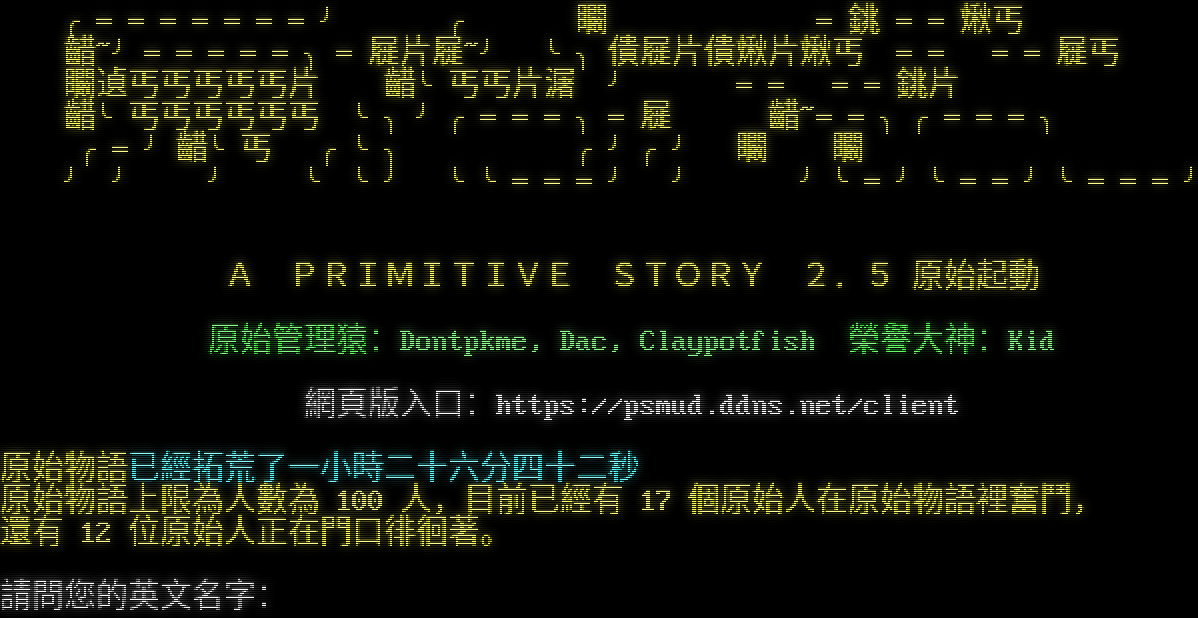 ╭═══════╯ ╭ 矙 ═銚 ══煍丐 齰~╯═════╮═屣片屣~╯ ╰╮僓屣片僓煍片煍丐 ══ ══屣丐 矙遉丐丐丐丐丐片 齰╰丐丐片潳 ╯ ══ ══銚片 齰╰丐丐丐丐丐丐 ╰╮╯╭═══╮═屣 齰~══╮╭═══╮ ╭═╯齰╰丐 ╭╰╮ ╭╯╭╯ 矙 矙 ╯ ╯ ╯ ╰ ╰╯ ╰╰═══╯ ╯ ╯╰═╯╰══╯╰═══╯ A PRIMITIVE STORY 2.5 原始起動 原始管理猿:Dontpkme, Dac, Claypotfish 榮譽大神:Kid 網頁版入口:https://psmud.ddns.net/client 原始物語已經拓荒了一小時二十六分四十二秒 原始物語上限為人數為 100 人,目前已經有 17 個原始人在原始物語裡奮鬥, 還有 12 位原始人正在門口徘徊著。 請問您的英文名字: