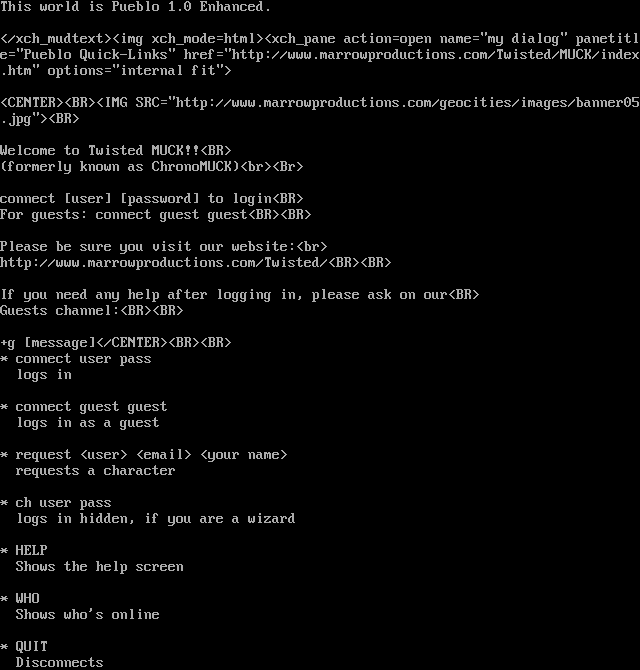 This world is Pueblo 1.0 Enhanced. </xch_mudtext><img xch_mode=html><xch_pane action=open name="my dialog" panetitle="Pueblo Quick-Links" href="http://www.marrowproductions.com/Twisted/MUCK/index.htm" options="internal fit"> <CENTER><BR><IMG SRC="http://www.marrowproductions.com/geocities/images/banner05.jpg"><BR> Welcome to Twisted MUCK!!<BR> (formerly known as ChronoMUCK)<br><Br> connect [user] [password] to login<BR> For guests: connect guest guest<BR><BR> Please be sure you visit our website:<br> http://www.marrowproductions.com/Twisted/<BR><BR> If you need any help after logging in, please ask on our<BR> Guests channel:<BR><BR> +g [message]</CENTER><BR><BR> \* connect user pass logs in \* connect guest guest logs in as a guest \* request <user> <email> <your name> requests a character \* ch user pass logs in hidden, if you are a wizard \* HELP Shows the help screen \* WHO Shows who's online \* QUIT Disconnects