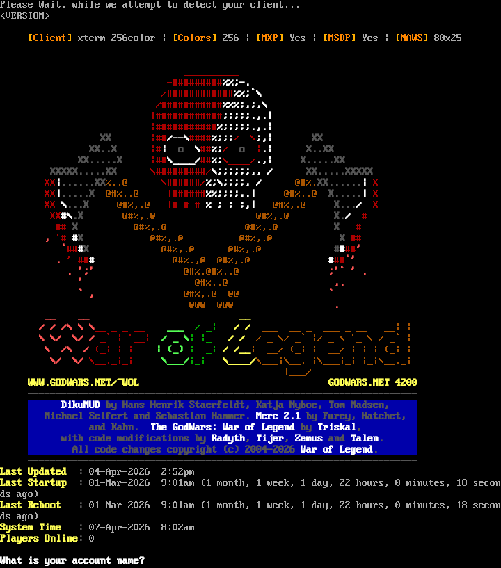 Please Wait, while we attempt to detect your client... <VERSION> [Client] xterm-256color \| [Colors] 256 \| [MXP] Yes \| [MSDP] Yes \| [NAWS] 80x25 _​_________ -​#########%%;-. /#​###########%%;\`\\ /#​##########%%%;,;,\\ \|#​###########;;;;;.,.\| \|#​##########%;;;;;.,.\| XX \|##/--\\#​###%;;;/--\\;,\| XX XX..X \|#\| o \\##%;/ o \|.\| X..XX XX.​....X \|##\\_​___/##%;\\_​___/.,\| X.​....XX XXXXX.​....XX \\#​########/\\;;;;;;,, / XX.​....XXXXX XX\|.​.....XX%,.@ \\#​#####/%;\\;;;;, / @#%,XX.​.....\| X XX\|.​....X @#%,.@ \|#​#####%%;;;;,.\| @#%,.@ X.​....\| X XX \\...X @#%,.@ \|# # # % ; ; ;,\| @#%,.@ X.../ X XX#\\.X @#%,.@ @#%,.@ X./ # ## X @#%,.@ @#%,.@ X # , '# #X @#%,.@ @#%,.@ X ## \`###X @#%,.@ @#%,.@ #​###' . ' ### @#%.,@ @#%,.@ ###\`' . ';' @#%.@#%,.@ ;'\` ' . ' @#%,.@ ,. \` , @#%,.@ @@ \` @@@ @@@ . __ __ __ __ _ / / /\\ \\ \\__ _ _ __ ___ / _\| / / ___ __ _ ___ _ __ __\| \| \\ \\/ \\/ / _\` \| '__\| / _ \\\| \|_ / / / _ \\/ _\` \|/ _ \\ '_ \\ / _\` \| \\ /\\ / (_\| \| \| \| (_) \| _\| / /__\| __/ (_\| \| __/ \| \| \| (_\| \| \\/ \\/ \\__,_\|_\| \\___/\|_\| \\_​___/\\___\|\\__, \|\\___\|_\| \|_\|\\__,_\| \|___/ WWW.GODWARS.NET/~WOL GODWARS.NET 4200 -​--------------------------------------------------------------------- DikuMUD by Hans Henrik Staerfeldt, Katja Nyboe, Tom Madsen, Michael Seifert and Sebastian Hammer. Merc 2.1 by Furey, Hatchet, and Kahn. The GodWars: War of Legend by Triskal, with code modifications by Radyth, Tijer, Zemus and Talen. All code changes copyright (c) 2004-2026 War of Legend. -​--------------------------------------------------------------------- Last Updated : 04-Apr-2026 2:52pm Last Startup : 01-Mar-2026 9:01am (1 month, 1 week, 1 day, 22 hours, 0 minutes, 18 seconds ago) Last Reboot : 01-Mar-2026 9:01am (1 month, 1 week, 1 day, 22 hours, 0 minutes, 18 seconds ago) System Time : 07-Apr-2026 8:02am Players Online: 0 What is your account name?
