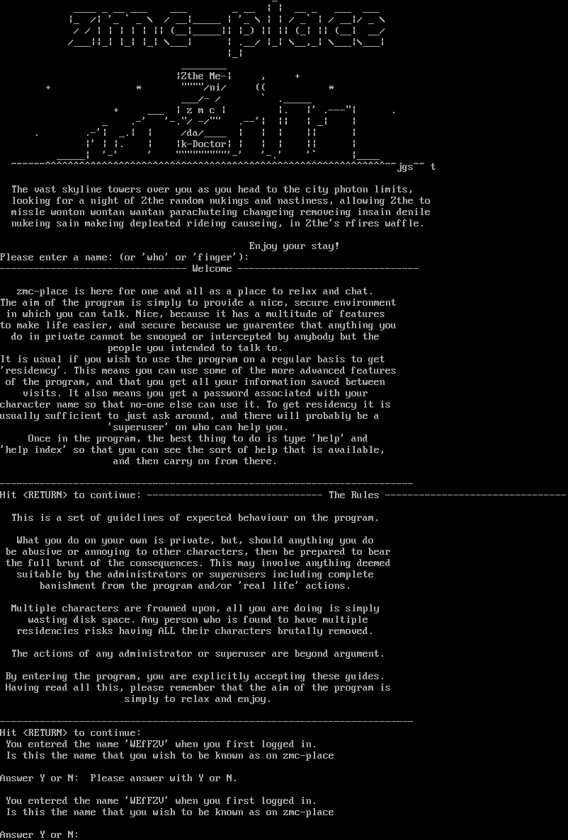 _ _​___ _ __ ___ ___ _ __ \| \| __ _ ___ ___ \|_ /\| '_ \` _ \\ / __\|_​____ \| '_ \\ \| \| / _\` \| / __\|/ _ \\ / / \| \| \| \| \| \|\| (__\|_​____\|\| \|_) \|\| \|\| (_\| \|\| (__\| __/ /___\|\|_\| \|_\| \|_\| \\___\| \| .__/ \|_\| \\__,_\| \\___\|\\___\| \|_\| _​_______ \|Zthe Me-\| , + + \* "​"""/ni/ (( \* ___/- / \` .​_____ + ___ \| z m c \| \|. \|' .​---"\| . _ .-' '-."/ -/"" .--'\| \|\| \| _\| \| . .-'\| _.\| \| /da/_​___ \| \| \| \|\| \| \|' \| \|. \| \|k-Doctor\| \| \| \| \|\| \| _​____\| '-' ' "​""""""""'-' '-.' '\` \|_​___ ~​~~~~~^^^^^^^^^^^^^^^^^^^^^^^^^^^^^^^^^^^^^^^^^^^^^^^^^^^^^^^^^^^^~~jgs~~ t The vast skyline towers over you as you head to the city photon limits, looking for a night of Zthe random nukings and nastiness, allowing Zthe to missle wonton wontan wantan parachuteing changeing removeing insain denile nukeing sain makeing depleated rideing causeing, in Zthe's rfires waffle. Enjoy your stay! Please enter a name: (or 'who' or 'finger'): -​-------------------------------- Welcome -​------------------------------- zmc-place is here for one and all as a place to relax and chat. The aim of the program is simply to provide a nice, secure environment in which you can talk. Nice, because it has a multitude of features to make life easier, and secure because we guarentee that anything you do in private cannot be snooped or intercepted by anybody but the people you intended to talk to. It is usual if you wish to use the program on a regular basis to get 'residency'. This means you can use some of the more advanced features of the program, and that you get all your information saved between visits. It also means you get a password associated with your character name so that no-one else can use it. To get residency it is usually sufficient to just ask around, and there will probably be a 'superuser' on who can help you. Once in the program, the best thing to do is type 'help' and 'help index' so that you can see the sort of help that is available, and then carry on from there. -​------------------------------------------------------------------------ Hit <RETURN> to continue: -​------------------------------ The Rules -​------------------------------- This is a set of guidelines of expected behaviour on the program. What you do on your own is private, but, should anything you do be abusive or annoying to other characters, then be prepared to bear the full brunt of the consequences. This may involve anything deemed suitable by the administrators or superusers including complete banishment from the program and/or 'real life' actions. Multiple characters are frowned upon, all you are doing is simply wasting disk space. Any person who is found to have multiple residencies risks having ALL their characters brutally removed. The actions of any administrator or superuser are beyond argument. By entering the program, you are explicitly accepting these guides. Having read all this, please remember that the aim of the program is simply to relax and enjoy. -​------------------------------------------------------------------------ Hit <RETURN> to continue: You entered the name 'WEfFZV' when you first logged in. Is this the name that you wish to be known as on zmc-place Answer Y or N: Please answer with Y or N. You entered the name 'WEfFZV' when you first logged in. Is this the name that you wish to be known as on zmc-place Answer Y or N: