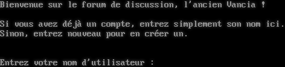 Bienvenue sur le forum de discussion, l'ancien Vancia ! Si vous avez déjà un compte, entrez simplement son nom ici. Sinon, entrez nouveau pour en créer un. Entrez votre nom d'utilisateur :