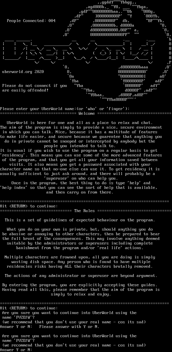 ,,ggddY"""Ybbgg,, ,agd888b,_ "Y8, ___\`""Ybga, ,gdP""88888888baa,.""8b "888g, ,dP" ]888888888P' "Y \`888Yb, People Connected: 004 ,dP" ,88888888P" db, "8P""Yb, ,8" ,888888888b, d8888a "8, ,8' d88888888888,88P"' a, \`8, ,8' 88888888888888PP" "" \`8, _​___ _​_____. __ __ .__ .​___ \`b \| \| \\_ \|__ _​__________/ \\ / \\_​__________\| \| __\| _/ 8 \| \| /\| __ \\_/ __ \\_ __ \\ \\/\\/ / _ \\_ __ \\ \| / __ \| 8 \| \| / \| \\_\\ \\ ___/\| \| \\/\\ ( <_> ) \| \\/ \|__/ /_/ \| 8 \|_​_____/ \|___ /\\___ >__\| \\__/\\ / \\_​___/\|__\| \|_​___/\\_​___ \| 8 \\/ \\/ \\/ \\/ ,P \`8, ,d8888888baaa ,8' uberworld.org 2020 8, 888888888888' ,8' \`8a "8888888888I a8' \`Yba \`Y8888888P' adP' Please do not connect if you "Yba \`888888P' adY" are easily offended! \`"Yba, d8888P" ,adP"' \`"Y8baa, ,d888P,ad8P"' \`""YYba8888P""'' Please enter your UberWorld name:(or 'who' or 'finger'): =​================================ Welcome =​=============================== UberWorld is here for one and all as a place to relax and chat. The aim of the program is simply to provide a nice, secure environment in which you can talk. Nice, because it has a multitude of features to make life easier, and secure because we guarentee that anything you do in private cannot be snooped or intercepted by anybody but the people you intended to talk to. It is usual if you wish to use the program on a regular basis to get 'residency'. This means you can use some of the more advanced features of the program, and that you get all your information saved between visits. It also means you get a password associated with your character name so that no-one else can use it. To get residency it is usually sufficient to just ask around, and there will probably be a 'superuser' on who can help you. Once in the program, the best thing to do is type 'help' and 'help index' so that you can see the sort of help that is available, and then carry on from there. =​======================================================================== Hit <RETURN> to continue: =​============================== The Rules =​=============================== This is a set of guidelines of expected behaviour on the program. What you do on your own is private, but, should anything you do be abusive or annoying to other characters, then be prepared to bear the full brunt of the consequences. This may involve anything deemed suitable by the administrators or superusers including complete banishment from the program and/or 'real life' actions. Multiple characters are frowned upon, all you are doing is simply wasting disk space. Any person who is found to have multiple residencies risks having ALL their characters brutally removed. The actions of any administrator or superuser are beyond argument. By entering the program, you are explicitly accepting these guides. Having read all this, please remember that the aim of the program is simply to relax and enjoy. =​======================================================================== Hit <RETURN> to continue: Are you sure you want to continue into UberWorld using the name 'FVZEfW'? (we recommend that you don't use your real name - cos its sad) Answer Y or N: Please answer with Y or N. Are you sure you want to continue into UberWorld using the name 'FVZEfW'? (we recommend that you don't use your real name - cos its sad) Answer Y or N: