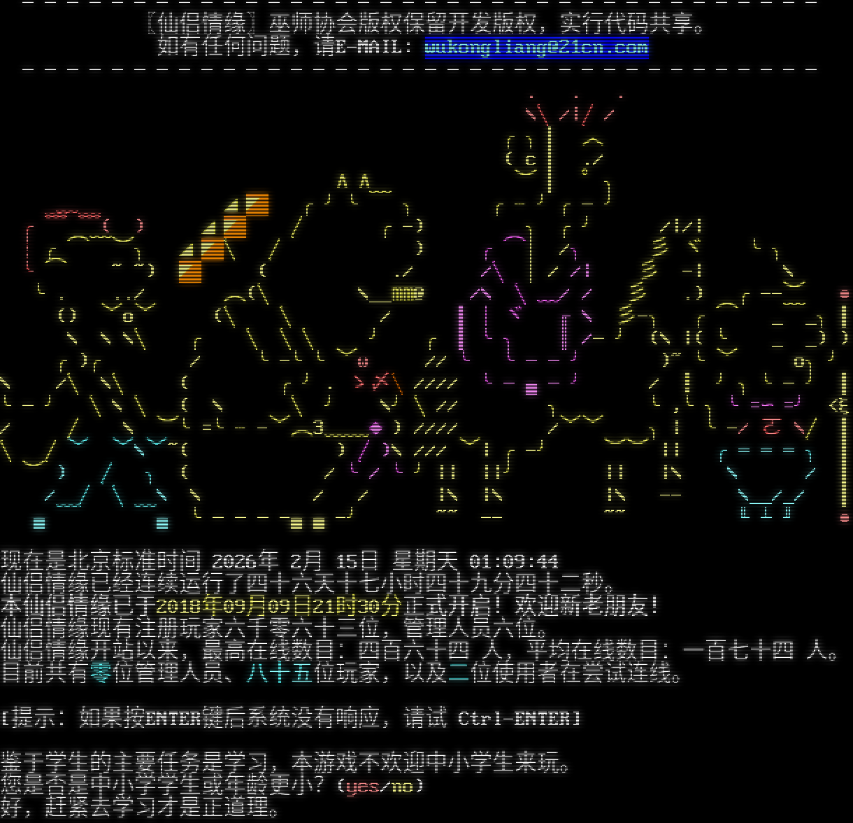 ──────────────────────────────────── 〖仙侣情缘〗巫师协会版权保留开发版权,实行代码共享。 如有任何问题,请E-MAIL: wukongliang@21cn.com ──────────────────────────────────── . . . \\╲/\|╱/ ╭╮▎ ︿ ( c ▎ ./ ∧∧ ︶ ▎ ゜╮ ﹏ ◢◤ ╭╯╰﹋ ╮ ╭┄╯╭─╯ ╭﹌ ﹌( ) ◢◤ ╱ ╭-) ╮ ╭╯ /\|/\| ┆╭⌒﹋︶╮ ◢◤╲ ╱ ) ╭⌒│ /╮ 彡 ヾ ╰╮ ╰⌒ ~ ~) ◤ ( ./ /╲ │/ /\| 彡 -\| \\ ╰. ../ ︵(╲ \\__㎜@ /\\ ╲﹏/ / 彡 .) ╭--︶ ● () ﹀o﹀ (╲ ╲ / ▍┊ヾ ╓\\ 彡-╮ ╭⌒ _﹋_╮┃ \\ \\ \\╲ ╭ ╲ ╲╲ ╯ ╭ ▍╰╮ ║/─╯ (\\ \|( ╰ _ _) ) ╭)╭ / ╰-╰╰﹀ω // ╰ ╰──╯ )~ ╰﹀ o╮╯ \\ /╲ \\╲ ( ╭╯. ゝ〆╲//// ╰─▄─╯ / ┇ ╯╮╰─╯ ┃ ╰─╯ ╲\\ ╲ ( \\ ╲ ╯ \\╯╲// ╮ ╰,╰╮╰=∽=╯ <ξ / ╱ \\ ︶╰=╰┄-﹀︵3﹏﹏◆) //// /﹀﹀ ╮\| ╰-/ ㄛ \\╱ ┃ ╲ ╱﹀ ﹀\\﹀~( ) ╱)\\ /// ﹀\| ╭-╯ ︶︶ \|\| ╭═══╮ ┃ ︶ ) ╱ ╮ ( / ╰/ ╰╯\|\| \|\|╯ \|\| \|\\ \\ / ┃ / ╱ ╲ \\ \\ / / \|\\ \|\\ \|\\ -- \\__/_/ ┃ ▄﹋ ﹋▄ ╰───-▄▄-╯ ~~ -- ~~ ╙┴╜ ● 现在是北京标准时间 2026年 2月 15日 星期天 01:09:44 仙侣情缘已经连续运行了四十六天十七小时四十九分四十二秒。 本仙侣情缘已于2018年09月09日21时30分正式开启!欢迎新老朋友! 仙侣情缘现有注册玩家六千零六十三位,管理人员六位。 仙侣情缘开站以来,最高在线数目:四百六十四 人,平均在线数目:一百七十四 人。 目前共有零位管理人员、八十五位玩家,以及二位使用者在尝试连线。 [提示:如果按ENTER键后系统没有响应,请试 Ctrl-ENTER] 鉴于学生的主要任务是学习,本游戏不欢迎中小学生来玩。 您是否是中小学学生或年龄更小?(yes/no) 好,赶紧去学习才是正道理。