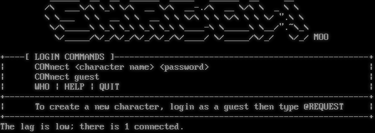 _​_____ __ __ _​_____ _​____ _​_____ __ __ /\\ ___\\/\\ \\_\\ \\/\\ __ \\/\\ _​_-./\\ __ \\/\\ \\ _ \\ \\ \\ \\___ \\ \\ __ \\ \\ __ \\ \\ \\/\\ \\ \\ \\/\\ \\ \\ \\/ ".\\ \\ \\/\\_​____\\ \\_\\ \\_\\ \\_\\ \\_\\ \\_​___-\\ \\_​____\\ \\__/".~\\_\\ \\/_​____/\\/_/\\/_/\\/_/\\/_/\\/_​___/ \\/_​____/\\/_/ \\/_/ MOO +​----[ LOGIN COMMANDS ]-​--------------------------------------------------+ \| CONnect <character name> <password> \| \| CONnect guest \| \| WHO \| HELP \| QUIT \| +​-------------------------------------------------------------------------+ \| To create a new character, login as a guest then type @REQUEST \| +​-------------------------------------------------------------------------+ The lag is low; there is 1 connected.