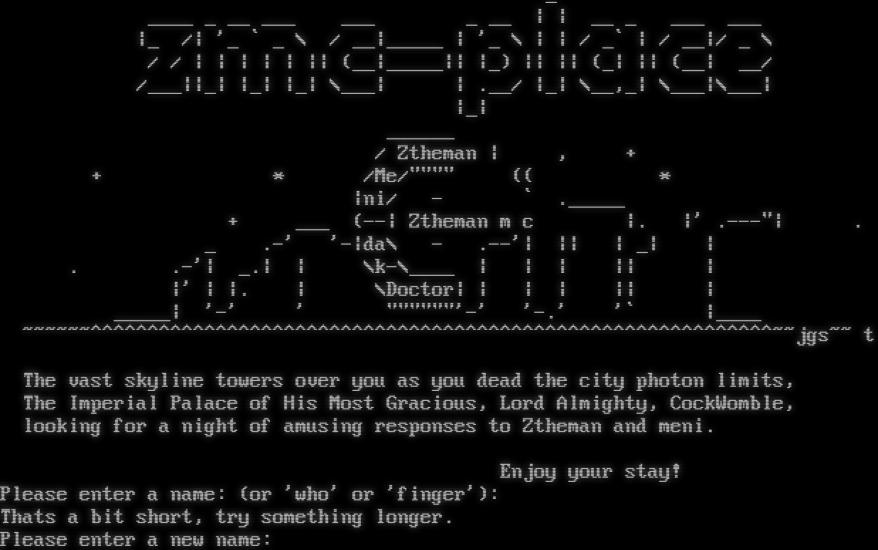_ _​___ _ __ ___ ___ _ __ \| \| __ _ ___ ___ \|_ /\| '_ \` _ \\ / __\|_​____ \| '_ \\ \| \| / _\` \| / __\|/ _ \\ / / \| \| \| \| \| \|\| (__\|_​____\|\| \|_) \|\| \|\| (_\| \|\| (__\| __/ /___\|\|_\| \|_\| \|_\| \\___\| \| .__/ \|_\| \\__,_\| \\___\|\\___\| \|_\| _​_____ / Ztheman \| , + + \* /Me/"​""" (( \* \|ni/ - \` .​_____ + ___ (--\| Ztheman m c \|. \|' .​---"\| . _ .-' '-\|da\\ - .--'\| \|\| \| _\| \| . .-'\| _.\| \| \\k-\\_​___ \| \| \| \|\| \| \|' \| \|. \| \\Doctor\| \| \| \| \|\| \| _​____\| '-' ' "​"""""'-' '-.' '\` \|_​___ ~​~~~~~^^^^^^^^^^^^^^^^^^^^^^^^^^^^^^^^^^^^^^^^^^^^^^^^^^^^^^^^^^^^~~jgs~~ t The vast skyline towers over you as you dead the city photon limits, The Imperial Palace of His Most Gracious, Lord Almighty, CockWomble, looking for a night of amusing responses to Ztheman and meni. Enjoy your stay! Please enter a name: (or 'who' or 'finger'): Thats a bit short, try something longer. Please enter a new name: