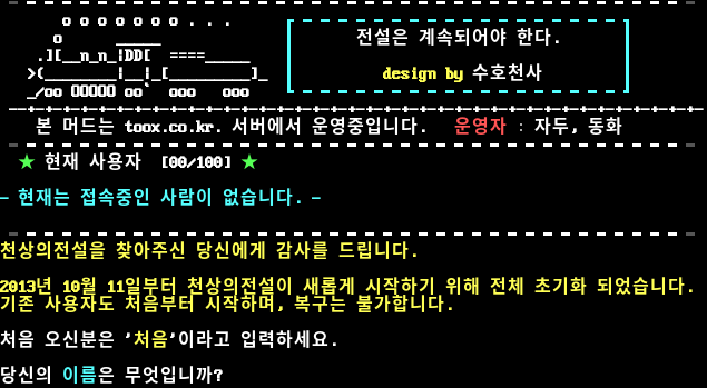 \|\|\|\|\|\|\|\|\|\|\|\|\|\|\|\|\|\|\|\|\|\|\|\|\|\|\|\|\|\|\|\|\|\|\|\|\|\|\|\|\|\|\|\|\|\|\|\|\|\|\|\|\|\|\|\|\|\|\|\|\|\|\|\|\|\|\|\|\|\|\|\|\|\|\|\|\|\| L E G E N D of H E A V E N \|\|\|\|\|\|\|\|\|\|\|\|\|\|\|\|\|\|\|\|\|\|\|\|\|\|\|\|\|\|\|\|\|\|\|\|\|\|\|\|\|\|\|\|\|\|\|\|\|\|\|\|\|\|\|\|\|\|\|\|\|\|\|\|\|\|\|\|\|\|\|\|\|\|\|\|\|\| , /\| __ [[ 천상의 전설 ]]™ / \| ,-~ / Y :\| // / \| jj /( .^ 끝나지 않는 영원한 모험! >-​"~"-v" / Y 사랑,우정,모험,용기,소망,믿음,행복 jo o \| ( ~T~ j 그 모든것을 여기서 느끼세요.. >._-' _./ / "~" \| 준비가 되셨다면.. Y _, \| /\| ;-"~ _ l 살짝.. [Enter]를 눌러주세요!!.. / l/ ,-"~ \ \//\/ .- \ Y / Y 모험을 시작합니다.​... l I ! ]\ _\ /"\ (" ~​----( ~ Y. ) Let's Go! ━━━━━━━━━━━━━━━━━━━━━━━━━━━━━━━━━━━━━━━  접속주소 : telnet toox.co.kr:6255 ━━━━━━━━━━━━━━━━━━━━━━━━━━━━━━━━━━━━━━━ 저희 천상의 전설을 찾아주셔서 감사합니다. \*^^\* [Enter] 를 눌러주세요. ━━━━━━━━━━━━━━━━━━━━━━━━━━━━━━━━━━━━━━━ o o o o o o o . . . ┏━━━━━━━━━━━━━━━━━━┓ o _​____ ┃ 전설은 계속되어야 한다. ┃ .][__n_n_\|DD[ =​===_____ ┃ ┃ >(_​_______\|__\|_[_​________]_ ┃ design by 수호천사 ┃ _/oo OOOOO oo\` ooo ooo ┗━━━━━━━━━━━━━━━━━━┛ -​-+-+-+-+-+-+-+-+-+-+-+-+-+-+-+-+-+-+-+-+-+-+-+-+-+-+-+-+-+-+-+-+-+-+-+-+-+-+- 본 머드는 toox.co.kr. 서버에서 운영중입니다. 운영자 : 자두, 동화 ━━━━━━━━━━━━━━━━━━━━━━━━━━━━━━━━━━━━━━━ ★ 현재 사용자 [00/100] ★ - 현재는 접속중인 사람이 없습니다. - ━━━━━━━━━━━━━━━━━━━━━━━━━━━━━━━━━━━━━━━ 천상의전설을 찾아주신 당신에게 감사를 드립니다. 2013년 10월 11일부터 천상의전설이 새롭게 시작하기 위해 전체 초기화 되었습니다. 기존 사용자도 처음부터 시작하며, 복구는 불가합니다. 처음 오신분은 '처음'이라고 입력하세요. 당신의 이름은 무엇입니까?