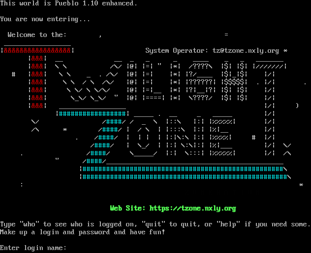 This world is Pueblo 1.10 enhanced. You are now entering... The Twilight Zone Welcome to the: , = _​________________ \|&&&&&&&&&&&&&&&&&\| System Operator: tz@tzone.nxly.org \* \|&&&\| __ __ _ _ _ _​___ _ _ _​______ \|&&&\| \\ \\ /\\/ \|@\| \|=\| " \|\*\| /????\\ \|$\| \|$\| \|///////\| # \|&&&\| \\ \\ _ . /\\/ \|@\| \|=\| \|\*\| \|?/_​___ \|$\|_\|$\| \|/\| \|&&&\| \\ \\ / \\ /\\/ \|@\| \|=\| \|\*\| \|??????\| \|$$$$$\| . \|/\| . \|&&&\| \\ \\/ \\ \\/\\/ \|@\| \|=\|__ \|\*\| \|?\|__\|?\| \|$\| \|$\| \|/\| \|&&&\| \\_\\/ \\_\\/ " \|@\| \|=​===\| \|\*\| \\????/ \|$\| \|$\| \|/\| \|&&&\| _​________________ \|/\| ) \|#​################\| _​____ . __ _ _​____ \|/\| \\/ /#​###/ / _ \\ \|::\\ \|:\| \|%%%%%\| \|/\| /\\ \* /#​###/ \| / \\ \| \|:::\\ \|:\| \|%\|__ \|/\| . /#​###/ \| \| \| \| \|:\|\\:\\ \|:\| \|%%%%\| # \|/\| /#​###/ \| \\_/ \| \|:\| \\:\\\|:\| \|%\|___ \|/\| \\/ . /#​###/ \\_​____/ \|:\| \\:::\| \|%%%%%\| \|/\| /\\ " /#​###/_​____________________________________________ \|#​##################################################\\ \|#​###################################################\\ : \* T H E F I N A L Z O N E R A T I O N Web Site: https://tzone.nxly.org Type "who" to see who is logged on, "quit" to quit, or "help" if you need some. Make up a login and password and have fun! Enter login name: