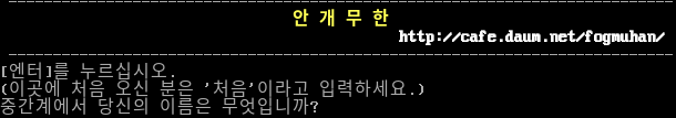 -​-------------------------------------------------------------------------- 안 개 무 한 http://cafe.daum.net/fogmuhan/ -​-------------------------------------------------------------------------- [엔터]를 누르십시오. (이곳에 처음 오신 분은 '처음'이라고 입력하세요.) 중간계에서 당신의 이름은 무엇입니까?