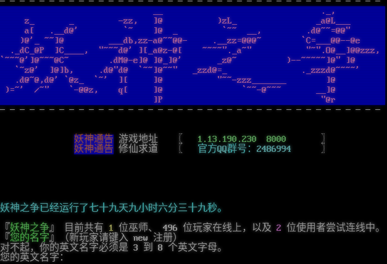 ─────────────────────────────────────── __ ._, z_ _ -zz, ]@ )zL_ _a@L___ a[ .__d@' \`~ ]@ _ \`~~ __, .d@~~=@@" )@'_ ~~]@ ___db,zz-a@~~@@- .__zz=@@@~ \`C=​___@@--@e ._dC_@P ]C_​___, "​~~~d@' ][_a@z-@[ ~​~~~"._a~" "​~".O@__]@@zzz, \`~~~@']@~~~@C~ .dM@-e]@ ]@_]@' _z@~ )-​-~~~~~]@" ]@ \`~z@' ]@]b, .d@"d@ \`~~]@~~" _zzd@=_ ._zzzd@~​~~~' .d@~@,d@' \`@z_ \`~' ][ ]@ "​~~-zzz_​______ ]@ )=~' /~" \`-@@z, q[ ]@ \`~~-@~~~ __]@ ]P "@r ─────────────────────────────────────── 妖神通告 游戏地址 〖 1.13.190.230 8000 〗 妖神通告 修仙求道 〖 官方QQ群号:2486994 〗 妖神之争已经运行了七十九天九小时六分三十九秒。 『妖神之争』 目前共有 1 位巫师、 496 位玩家在线上,以及 2 位使用者尝试连线中。 『您的名字』(新玩家请键入 new 注册) 对不起,你的英文名字必须是 3 到 8 个英文字母。 您的英文名字: