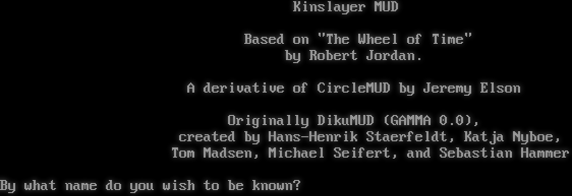 Kinslayer MUD Based on "The Wheel of Time" by Robert Jordan. A derivative of CircleMUD by Jeremy Elson Originally DikuMUD (GAMMA 0.0), created by Hans-Henrik Staerfeldt, Katja Nyboe, Tom Madsen, Michael Seifert, and Sebastian Hammer By what name do you wish to be known?