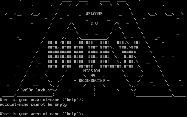 . _​___ _​___ _​___ _​___ . . . / /__/ /_​____\\ \\__\\ \\ . _​___ _​___ _​______/ _ \\_​______ _​___ _​___ / /__/ /__/ / -_ _ WELCOME -_ \\ \\__\\ \\__\\ \\ - - / - _ _ \\ - - _- / /\\ T O /\\ - \\ _ - / - /..\\ _ /..\\ \\ - / -- /. .\\ _ _- /. .\\ \\ _- -_ / /. .\\_​__________/. .\\ - \\ _- / #​### /#​### #​##### #​###. #​##.\\ ### \\ - - / #​###/.​#### #​### #​### #​###\\. #​##.\\### \\ - / #​######### #​### #​### #​### \\. #​##### \\ / #​#########/#​### #​### #​### \\. #​###\\ \\ - - / _ #​### #​### #​### #​### #​### \\. #​###.\\ __ \\ - / - #​### #​### #​##### #​########.#### .\\ \\ _ / /. ./ MISSION \\. .\\ - \\ - - / - \\. ./ \\ 99 / \\. ./ \\ / \\. ./ - RESURRECTED - \\. ./ _ \\ - - / --_ \\../___ __ _ / . \\ _ __ ___\\../ - \\ - / hm99r.luxh.at\\/ / \| \\ \\/ \\ _​____/_​______________\| \| \|_​______________\\_​____ What is your account-name ('help'): account-name cannot be empty. What is your account-name ('help'):