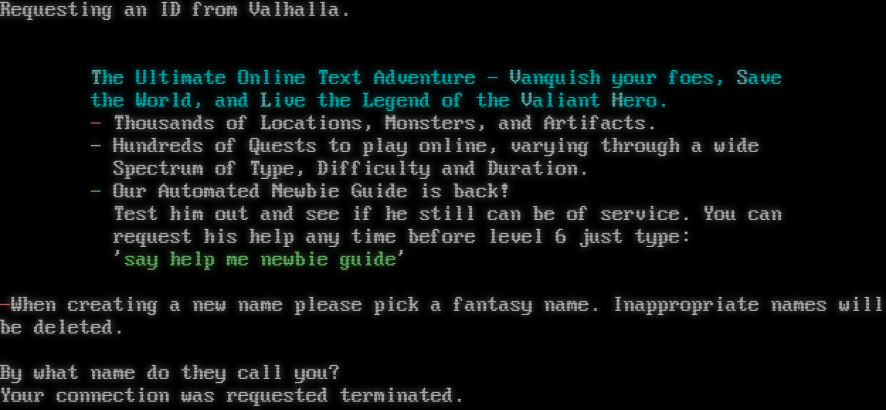 Requesting an ID from Valhalla. The Ultimate Online Text Adventure - Vanquish your foes, Save the World, and Live the Legend of the Valiant Hero. - Thousands of Locations, Monsters, and Artifacts. - Hundreds of Quests to play online, varying through a wide Spectrum of Type, Difficulty and Duration. - Our Automated Newbie Guide is back! Test him out and see if he still can be of service. You can request his help any time before level 6 just type: 'say help me newbie guide' -When creating a new name please pick a fantasy name. Inappropriate names will be deleted. By what name do they call you? Your connection was requested terminated.