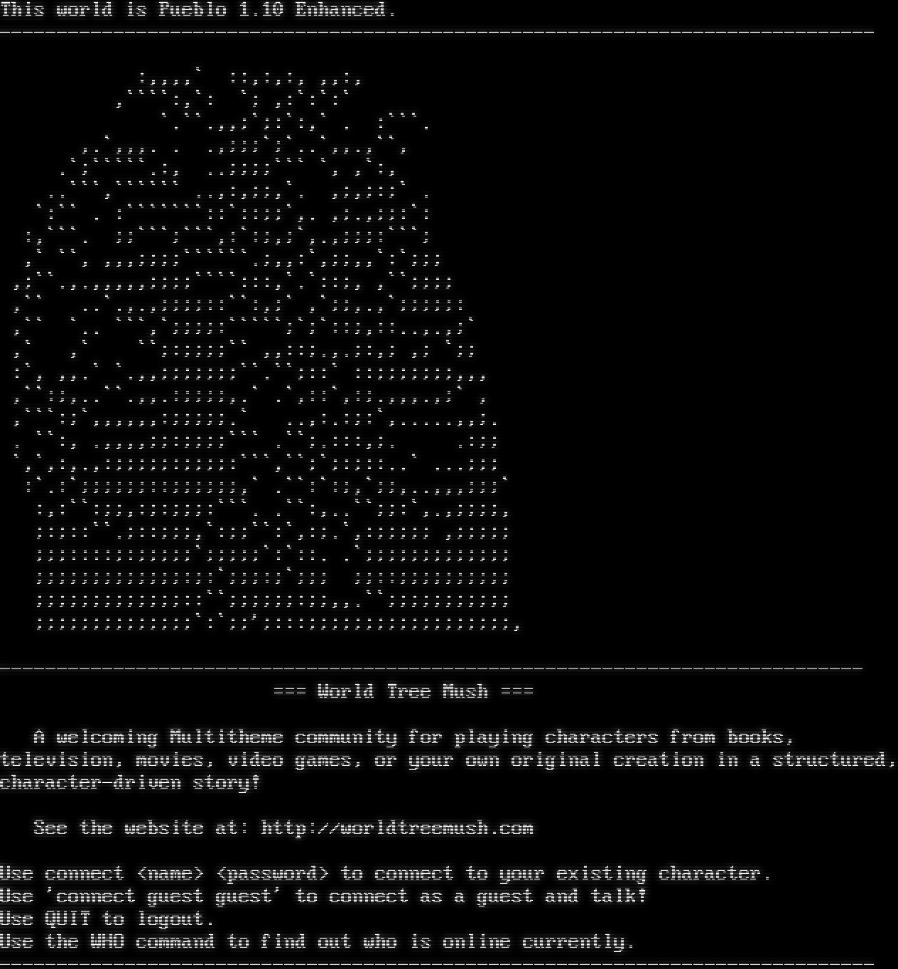 This world is Pueblo 1.10 Enhanced. -​---------------------------------------------------------------------------- :,,,,\` ::,:,:, ,,:, ,\`\`\`\`:,\`: \`; ,:\`:\`:\` \`.\`\`.,,;\`;:\`:,\` . :\`\`\`. ,.\`,,,. . .,;;;\`;\`..\`,,.,\`\`, .\`;\`\`\`\`\`.:, ..;;;;\`\`\` \`, ,\`:, ..\`\`\`,\`\`\`\`\`\` ..,:,;;,\`. ,;,;:;\` . \`:\`\` . :\`\`\`\`\`\`\`::\`::;;\`,. ,;.,;;:\`: :,\`\`\`. ;;\`\`\`;\`\`\`,:\`:;,;\`,.,;;;:\`\`\`; ,\` \`\`, ,,,;;;;\`\`\`\`\`\`.;,,:\`,;;,,\`:\`;;; ,;\`\`.,.,,,,,;;;;\`\`\`\`:::,\`.\`::;, ,\`\`;;;; ,\`\` ..\`.,.,;;;;::\`\`:,;\` ,\`;;,.,\`;;;;;: ,\`\` \`.. \`\`\`,\`;;;;:\`\`\`\`\`;\`;\`::;,::..,.,;\` ,\` ,\` \`\`;:;;;;\`\` ,,::;.,.;:,; ,; \`;; :\`, ,,.\` \`.,,;;;;;;;\`\`.\`\`;::\` ::;;;;;;;,,, ,\`\`:;,..\`\`.,,.:;;;;,.\` .\`,::\`,:;.,,,.,;\` , ,\`\`\`:;\`,,,,,,:;;;;;.\` ..,:.:;:\`,.​....,,;. . \`\`:, .,,,,;;:;;;;\`\`\` .\`\`;.:::,;. .:;; \`,\`,:,.,:;;;;;:;;;;:\`\`\`,\`\`;\`;:;::..\` ...;;; :\`.:\`;;;;;;::;;;;;;,\` .\`\`:\`:;,\`;;,..,,,;;;\` :,:\`\`:;;,:;:;;;:\`\`\`. .\`\`:,..\`\`;;:\`,.,;;;;, ;:;::\`\`.;::;;;,\`:;;\`\`:\`,:;.\`,:;;;;; ,;;;;; ;;;::::;:;;;;;\`;;;;;\`:\`::. .\`;;;;;;;;;;;;; ;;;;;;;;;;;;;:;:\`;;;:;\`;;; ;;::;;;;;;;;;; ;;;;;;;;;;;;;::\`\`;;;;;;:;;,,.\`\`;;;;;;;;;;; ;;;;;;;;;;;;;;\`:\`;;';:::;;;;;;;;;;;;;;;;;;, -​--------------------------------------------------------------------------- === World Tree Mush === A welcoming Multitheme community for playing characters from books, television, movies, video games, or your own original creation in a structured, character-driven story! See the website at: http://worldtreemush.com Use connect <name> <password> to connect to your existing character. Use 'connect guest guest' to connect as a guest and talk! Use QUIT to logout. Use the WHO command to find out who is online currently. -​----------------------------------------------------------------------------