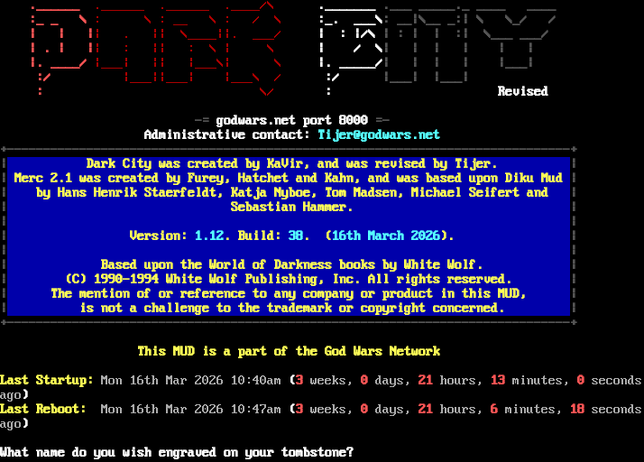 .​______ .​______ .​______ .​____/\\ .​_______ .​___ _​____._ _​___ _​___ :_ _ \\ : \\ : __ \\ : / \\ :_. ___\\: __\|\\__ _:\| \\ \\_/ / \| \| \|\| . \|\| \\_​___\|\|. ___/ \| : \|/\\ \| : \| \| :\| \\___ ___/ \| . \| \|\| : \|\| : \\ \| \\ \| / \\\| \| \| \| \| \| \|. _​___/ \|___\| \|\| \|___\\\| \\ \|. _​____/\| \| \| \| \|___\| :/ \|___\|\|___\| \|___\\ / :/ \|___\| \|___\| : \\/ : Revised -= godwars.net port 8000 =- Administrative contact: Tijer@godwars.net +​------------------------------------------------------------------------------+ \| Dark City was created by KaVir, and was revised by Tijer. \| \| Merc 2.1 was created by Furey, Hatchet and Kahn, and was based upon Diku Mud \| \| by Hans Henrik Staerfeldt, Katja Nyboe, Tom Madsen, Michael Seifert and \| \| Sebastian Hammer. \| \| \| \| Version: 1.12. Build: 38. (16th March 2026). \| \| \| \| Based upon the World of Darkness books by White Wolf. \| \| (C) 1990-1994 White Wolf Publishing, Inc. All rights reserved. \| \| The mention of or reference to any company or product in this MUD, \| \| is not a challenge to the trademark or copyright concerned. \| +​------------------------------------------------------------------------------+ This MUD is a part of the God Wars Network Last Startup: Mon 16th Mar 2026 10:40am (3 weeks, 0 days, 21 hours, 13 minutes, 0 seconds ago) Last Reboot: Mon 16th Mar 2026 10:47am (3 weeks, 0 days, 21 hours, 6 minutes, 18 seconds ago) What name do you wish engraved on your tombstone?