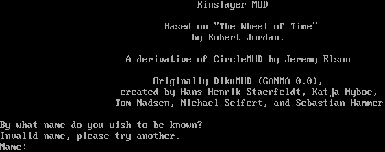 Kinslayer MUD Based on "The Wheel of Time" by Robert Jordan. A derivative of CircleMUD by Jeremy Elson Originally DikuMUD (GAMMA 0.0), created by Hans-Henrik Staerfeldt, Katja Nyboe, Tom Madsen, Michael Seifert, and Sebastian Hammer By what name do you wish to be known? Invalid name, please try another. Name: