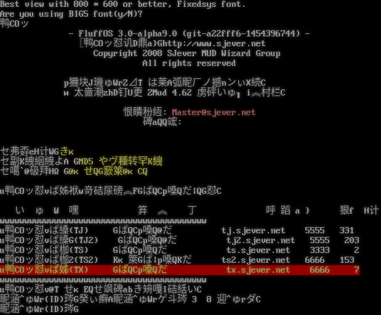 Best view with 800 \* 600 or better, Fixedsys font. Are you using BIG5 font(y/N)? 鸭COッ - FluffOS 3.0-alpha9.0 (git-a22fff6-1454396744) - 〖鸭COッ怼讥D鼎a}Ghttp://www.sjever.net Copyright 2008 SJever MUD Wizard Group All rights reserved p狦块J璣ゅWrZ⊿Τは莱A弧眤ㄏノ撼nンぃX続C и太啬潮zhD钉U更 ZMud 4.62 虏砰いゅ┒i︽村栏C 恨瞶秎絚: Master@sjever.net 碑aQQ竤: 48833698  セ弗孬eH计WGきκ セ副K絏絪絏よΑGMD5 やヴ種转罕K絏 セ噶\`@砐拜HΩG@κせQG窾箂@κCQ u鸭COッ怼vぱ姊袱w竒硈尿磅︽FGぱQCp嗓Qだ\|QG怼C い ゅ W 嘿 笲 ︽ 丁 呼 蹈 a } 狠f H计 wwwwwwwwwwwwwwwwwwwwwwwwwwwwwwwwwwwwwwwwww u鸭COッ怼vぱ縔(TJ) GぱQCp嗓Q@だ tj.sjever.net 5555 331 u鸭COッ怼vぱ縔G(TJ2) GぱQCp嗓Q@だ tj2.sjever.net 5555 203 u鸭COッ怼vぱ枷(TS) GぱQCp嗓Qだ ts.sjever.net 3333 2 u鸭COッ怼vぱ枷2(TS2) Kκ箂Gぱ\|p嗓QKだ ts2.sjever.net 6666 153 u鸭COッ怼vぱ姊(TX) GぱQCp嗓Qだ tx.sjever.net 6666 7 wwwwwwwwwwwwwwwwwwwwwwwwwwwwwwwwwwwwwwwwww u鸭COッ怼v@ΤせκEQせ飒碑abき矪嘎I硈絬いC 眤涵^ゅWr(ID)琌G癸ぃ癬A眤涵^ゅWrゲ斗琌 3 8 迎^ゅrダC 眤涵^ゅWr(ID)琌G