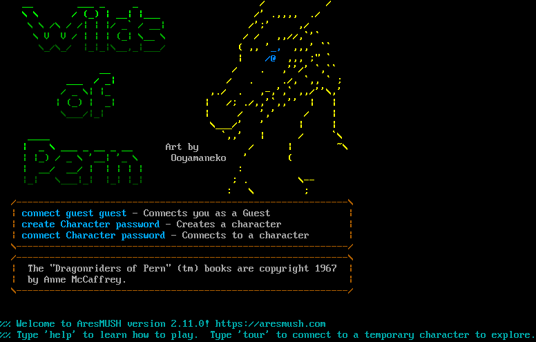 __ ___ _ _ / / \\ \\ / (_) \| __\| \|___ /' .,,,, ./ \\ \\ /\\ / /\| \| \|/ _\` / __\| /';' ,/ \\ V V / \| \| \| (_\| \\__ \\ / / ,,//,\`'\` \\_/\\_/ \|_\|_\|\\__,_\|___/ ( ,, '_, ,,,' \`\` \| /@ ,,, ;" \` __ / . ,''/' \`,\`\` ___ / _\| / . ./, \`,, \` ; / _ \\\| \|_ ,./ . ,-,',\` ,,/''\\,' \| (_) \| _\| \| /; ./,,'\`,,'' \| \| \\___/\|_\| \| / ',' / \| \\___/' ' \| \| _​___ \`,,' \| / \`\\ \| _ \\ ___ _ __ _ __ Art by / \| ~\\ \| \|_) / _ \\ '__\| '_ \\ Ooyamaneko ' ( \| __/ __/ \| \| \| \| \| : \|_\| \\___\|_\| \|_\| \|_\| ; . \\-- : \\ ; /-​-----------------------------------------------------------\\ \| connect guest guest - Connects you as a Guest \| \| create Character password - Creates a character \| \| connect Character password - Connects to a character \| \\-​-----------------------------------------------------------/ /-​-----------------------------------------------------------\\ \| The "Dragonriders of Pern" (tm) books are copyright 1967 \| \| by Anne McCaffrey. \| \\-​-----------------------------------------------------------/ %% Welcome to AresMUSH version 2.11.0! https://aresmush.com %% Type 'help' to learn how to play. Type 'tour' to connect to a temporary character to explore.