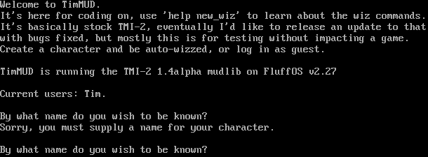 Welcome to TimMUD. It's here for coding on, use 'help new_wiz' to learn about the wiz commands. It's basically stock TMI-2, eventually I'd like to release an update to that with bugs fixed, but mostly this is for testing without impacting a game. Create a character and be auto-wizzed, or log in as guest. TimMUD is running the TMI-2 1.4alpha mudlib on FluffOS v2.27 Current users: Tim. By what name do you wish to be known? Sorry, you must supply a name for your character. By what name do you wish to be known?