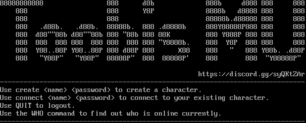 88888888888 888 d8b 888b d888 888 888 888 888 Y8P 8888b d8888 888 888 888 888 88888b.d88888 888 888 888 .d88b. .d88b. 88888b. 888 .d8888b 888Y88888P888 888 888 888 d88""88b d88""88b 888 "88b 888 88K 888 Y888P 888 888 888 888 888 888 888 888 888 888 888 "Y8888b. 888 Y8P 888 888 888 888 Y88..88P Y88..88P 888 d88P 888 X88 888 " 888 Y88b. .d88P 888 "Y88P" "Y88P" 88888P" 888 88888P' 888 888 "Y88888P" https://discord.gg/syQKtZAr -​---------------------------------------------------------------------------- Use create <name> <password> to create a character. Use connect <name> <password> to connect to your existing character. Use QUIT to logout. Use the WHO command to find out who is online currently. -​----------------------------------------------------------------------------