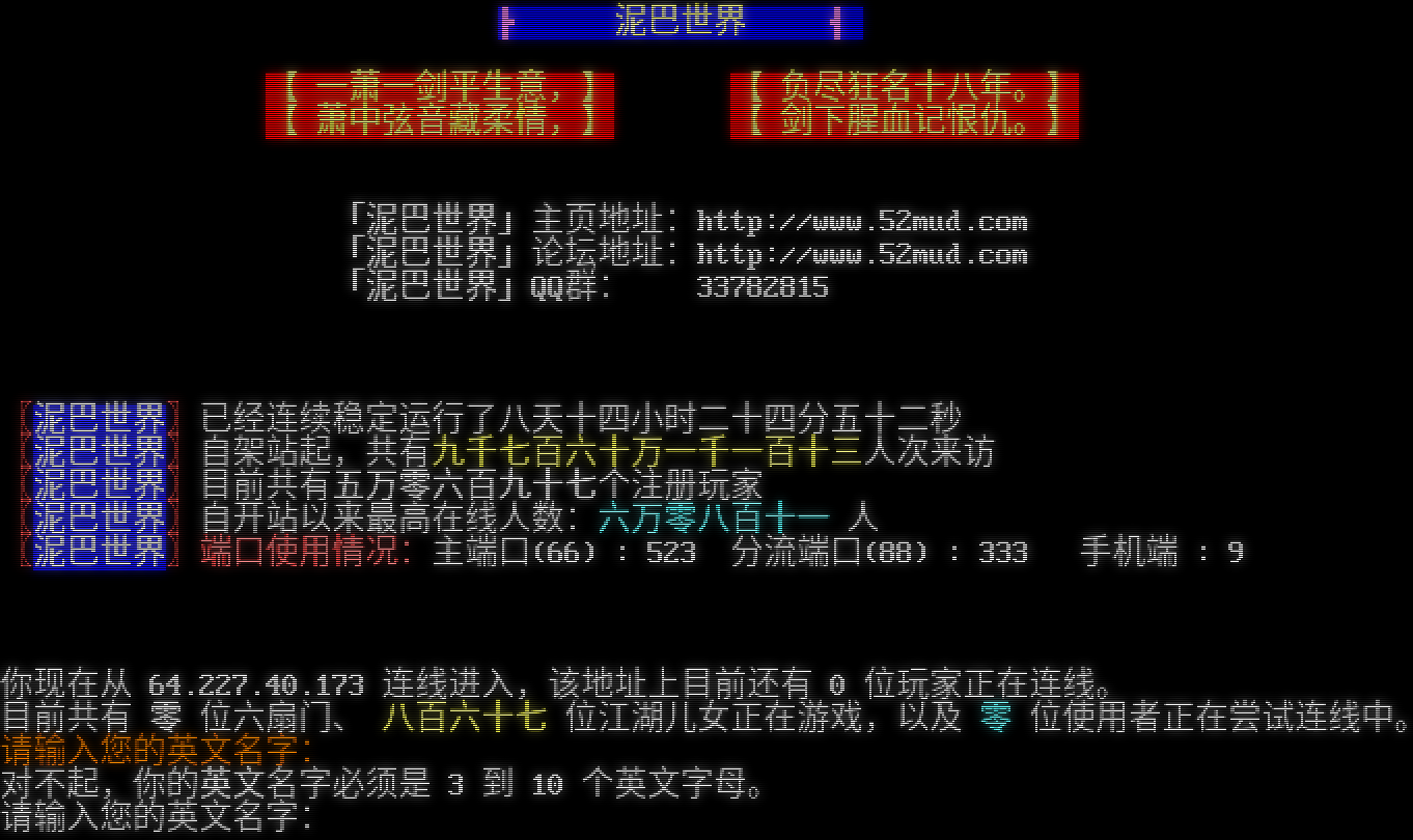 ┣ 泥巴世界 ┫ 【 一萧一剑平生意,】 【 负尽狂名十八年。】 【 萧中弦音藏柔情,】 【 剑下腥血记恨仇。】 「泥巴世界」主页地址:http://www.52mud.com 「泥巴世界」论坛地址:http://www.52mud.com 「泥巴世界」QQ群: 33782815 〖泥巴世界〗已经连续稳定运行了八天十四小时二十四分五十二秒 〖泥巴世界〗自架站起,共有九千七百六十万一千一百十三人次来访 〖泥巴世界〗目前共有五万零六百九十七个注册玩家 〖泥巴世界〗自开站以来最高在线人数:六万零八百十一 人 〖泥巴世界〗端口使用情况:主端口(66) : 523 分流端口(88) : 333 手机端 : 9 你现在从 64.227.40.173 连线进入,该地址上目前还有 0 位玩家正在连线。 目前共有 零 位六扇门、 八百六十七 位江湖儿女正在游戏,以及 零 位使用者正在尝试连线中。 请输入您的英文名字: 对不起,你的英文名字必须是 3 到 10 个英文字母。 请输入您的英文名字: