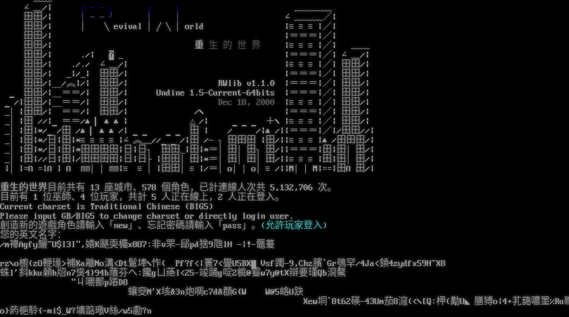 ﹏﹏ ∠﹏/\| ┌──╮ ┌ ┐ ﹏﹏﹏﹏ 田田/\| │──╯ │ │ ∠﹏﹏﹏/\| 田田/\| │ ╲evival │╱╲│orld \|≡≡≡\|/\| 田田/\| \|===\|/\| 田田/\| 重 生 的 世 界 \|≡≡≡\|/\| ﹏﹏ 田田/\| ./\| ˍ_ \|===\|/\| ∠﹏/\| 田田/\| ././ ∠﹏/\| \|≡≡≡\|/\| 田田/\| 田田/\| _\|/_\| 田田/\| \|===\|/\| 田田/\| 田田/\| /︽\|/\| 田田/\| RWlib v1.1.0 \|===\|/\| 田田/\| ▁ 田田/\| ̄==/\| 田田/\| Undine 1.5-Current-64bits \|===\|/\| 田田/\| ▁/\|田田/\| ̄==/\| 田田/\| Dec 18, 2000 \|≡≡≡\|/\| 田田/\| _│\|田田/\| ̄==/\| 田田/\| /\\ \|===\|/\| 田田/\| _│\|田 //\|▁==/▲▎▲▲\| △/\| ▁▁▁ +\\ \|≡≡≡\|/\| 田田/\| _│\|田\|\*/▁/田 /▲▎▲▲/\| ▁▁ ▁▁ 田 \| / /\|▲/\|\|===\|/\|/田田//\| _│\|田\|\*/日\|田\|\*≡≡≡≡\|∠︽﹏//▁▁/\|田 /─┐田田田 \|田/\|\|≡≡≡\|▲/田田田/\| _│\|田\|\*/日\|田\|\*田田田田\|日\|日┐ 田田_\|田\|\*=│田│田┐田/\|\|===\|田\|田│田/\| _│\|田\|//日\|田\|/田田田田\|日\|日├\|田田│田\|\*=│田│田│田/\|\|≡≡≡\|田\|田│田/\| \|│\|=∩=\|∩\| ∩ ㎜││㎜\|≡ ≡│\|田田│≡\|/=│o││o│≡/\|\|M││M\|==\|田∩田/\| 重生的世界目前共有 13 座城市、578 個角色,已計連線人次共 5,132,706 次。 目前有 1 位巫師、4 位玩家,共計 5 人正在線上,2 人正在登入。 Current charset is Traditional Chinese (BIG5) Please input GB/BIG5 to change charset or directly login user. 創造新的遊戲角色請輸入「new」、忘記密碼請輸入「pass」。(允許玩家登入) 您的英文名字: /m褘Agfy鱺 ~U$I3I",媴K颶耎欘x8O7:非v罘-郈pd猞9虺lH -\|!-虌萲 )%1搹5j噷.9站?3^ 攍蛌By\*Mpb婪奴遏g鮦u rz\\o櫥(zO鞭瑑>補Ka離No溝<Dt鬄埲\\怍( Pf?f<\|瞏7<舋U5BX▇Vsf 躅-9,Chz臏\`Gr鴞罕/4J/a<顉4zydfx59H ~X8 ЪE$埤 xH疊@>$x瑾R氙驦Dgq k\`浥r8釫砯(蒙渜%-竣踊g啶Z榳@霯w7y@tX辯要瑾Qb浻鰲 t篁]\`{Z,q峌un3<7熧4}94b藬芬へ:饞gㄩ蕝I<25 蛛 l'斜kku顙h牊n "ㄐ嚫鄯p蹖D8 蠰窔N'X垓&3n炮啁c7d&頵G{W W@5峈U趹 Xew垌\`8t62碤-43Um茄8滱(<\\[Q:柙(勱U◣膳猼o\|4+芤藹噥罣%Ru瞻o}菂梔駖{-mi$_W?壙踮璥V絲/w5勴?n