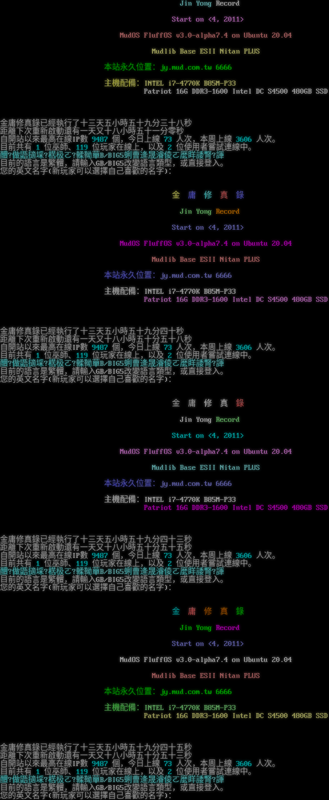 金 庸 修 真 錄 Jin Yong Record Start on <4, 2011> MudOS FluffOS v3.0-alpha7.4 on Ubuntu 20.04 Mudlib Base ESII Nitan PLUS 本站永久位置:jy.mud.com.tw 6666 主機配備:INTEL i7-4770K B85M-P33 Patriot 16G DDR3-1600 Intel DC S4500 480GB SSD 金庸修真錄已經執行了十三天五小時五十九分三十三秒 距離下次重新啟動還有一天又十八小時五十一分五秒 自開站以來最高在線IP數 9487 個,今日上線 73 人次,本周上線 3606 人次。 目前共有 1 位巫師、119 位玩家在線上,以及 2 位使用者嘗試連線中。 醴?做鼯擿埰?楛极ㄛ?輮靿蕇B/BIG5蜊曹逄晟濬倰ㄛ麼眻諉腎?諢 目前的語言是繁體,請輸入GB/BIG5改變語言類型,或直接登入。 您的英文名字(新玩家可以選擇自己喜歡的名字): 金 庸 修 真 錄 Jin Yong Record Start on <4, 2011> MudOS FluffOS v3.0-alpha7.4 on Ubuntu 20.04 Mudlib Base ESII Nitan PLUS 本站永久位置:jy.mud.com.tw 6666 主機配備:INTEL i7-4770K B85M-P33 Patriot 16G DDR3-1600 Intel DC S4500 480GB SSD 金庸修真錄已經執行了十三天五小時五十九分三十六秒 距離下次重新啟動還有一天又十八小時五十一分二秒 自開站以來最高在線IP數 9487 個,今日上線 73 人次,本周上線 3606 人次。 目前共有 1 位巫師、119 位玩家在線上,以及 2 位使用者嘗試連線中。 醴?做鼯擿埰?楛极ㄛ?輮靿蕇B/BIG5蜊曹逄晟濬倰ㄛ麼眻諉腎?諢 目前的語言是繁體,請輸入GB/BIG5改變語言類型,或直接登入。 您的英文名字(新玩家可以選擇自己喜歡的名字): 金 庸 修 真 錄 Jin Yong Record Start on <4, 2011> MudOS FluffOS v3.0-alpha7.4 on Ubuntu 20.04 Mudlib Base ESII Nitan PLUS 本站永久位置:jy.mud.com.tw 6666 主機配備:INTEL i7-4770K B85M-P33 Patriot 16G DDR3-1600 Intel DC S4500 480GB SSD 金庸修真錄已經執行了十三天五小時五十九分三十八秒 距離下次重新啟動還有一天又十八小時五十一分零秒 自開站以來最高在線IP數 9487 個,今日上線 73 人次,本周上線 3606 人次。 目前共有 1 位巫師、119 位玩家在線上,以及 2 位使用者嘗試連線中。 醴?做鼯擿埰?楛极ㄛ?輮靿蕇B/BIG5蜊曹逄晟濬倰ㄛ麼眻諉腎?諢 目前的語言是繁體,請輸入GB/BIG5改變語言類型,或直接登入。 您的英文名字(新玩家可以選擇自己喜歡的名字): 金 庸 修 真 錄 Jin Yong Record Start on <4, 2011> MudOS FluffOS v3.0-alpha7.4 on Ubuntu 20.04 Mudlib Base ESII Nitan PLUS 本站永久位置:jy.mud.com.tw 6666 主機配備:INTEL i7-4770K B85M-P33 Patriot 16G DDR3-1600 Intel DC S4500 480GB SSD 金庸修真錄已經執行了十三天五小時五十九分四十秒 距離下次重新啟動還有一天又十八小時五十分五十八秒 自開站以來最高在線IP數 9487 個,今日上線 73 人次,本周上線 3606 人次。 目前共有 1 位巫師、119 位玩家在線上,以及 2 位使用者嘗試連線中。 醴?做鼯擿埰?楛极ㄛ?輮靿蕇B/BIG5蜊曹逄晟濬倰ㄛ麼眻諉腎?諢 目前的語言是繁體,請輸入GB/BIG5改變語言類型,或直接登入。 您的英文名字(新玩家可以選擇自己喜歡的名字): 金 庸 修 真 錄 Jin Yong Record Start on <4, 2011> MudOS FluffOS v3.0-alpha7.4 on Ubuntu 20.04 Mudlib Base ESII Nitan PLUS 本站永久位置:jy.mud.com.tw 6666 主機配備:INTEL i7-4770K B85M-P33 Patriot 16G DDR3-1600 Intel DC S4500 480GB SSD 金庸修真錄已經執行了十三天五小時五十九分四十三秒 距離下次重新啟動還有一天又十八小時五十分五十五秒 自開站以來最高在線IP數 9487 個,今日上線 73 人次,本周上線 3606 人次。 目前共有 1 位巫師、119 位玩家在線上,以及 2 位使用者嘗試連線中。 醴?做鼯擿埰?楛极ㄛ?輮靿蕇B/BIG5蜊曹逄晟濬倰ㄛ麼眻諉腎?諢 目前的語言是繁體,請輸入GB/BIG5改變語言類型,或直接登入。 您的英文名字(新玩家可以選擇自己喜歡的名字): 金 庸 修 真 錄 Jin Yong Record Start on <4, 2011> MudOS FluffOS v3.0-alpha7.4 on Ubuntu 20.04 Mudlib Base ESII Nitan PLUS 本站永久位置:jy.mud.com.tw 6666 主機配備:INTEL i7-4770K B85M-P33 Patriot 16G DDR3-1600 Intel DC S4500 480GB SSD 金庸修真錄已經執行了十三天五小時五十九分四十五秒 距離下次重新啟動還有一天又十八小時五十分五十三秒 自開站以來最高在線IP數 9487 個,今日上線 73 人次,本周上線 3606 人次。 目前共有 1 位巫師、119 位玩家在線上,以及 2 位使用者嘗試連線中。 醴?做鼯擿埰?楛极ㄛ?輮靿蕇B/BIG5蜊曹逄晟濬倰ㄛ麼眻諉腎?諢 目前的語言是繁體,請輸入GB/BIG5改變語言類型,或直接登入。 您的英文名字(新玩家可以選擇自己喜歡的名字):