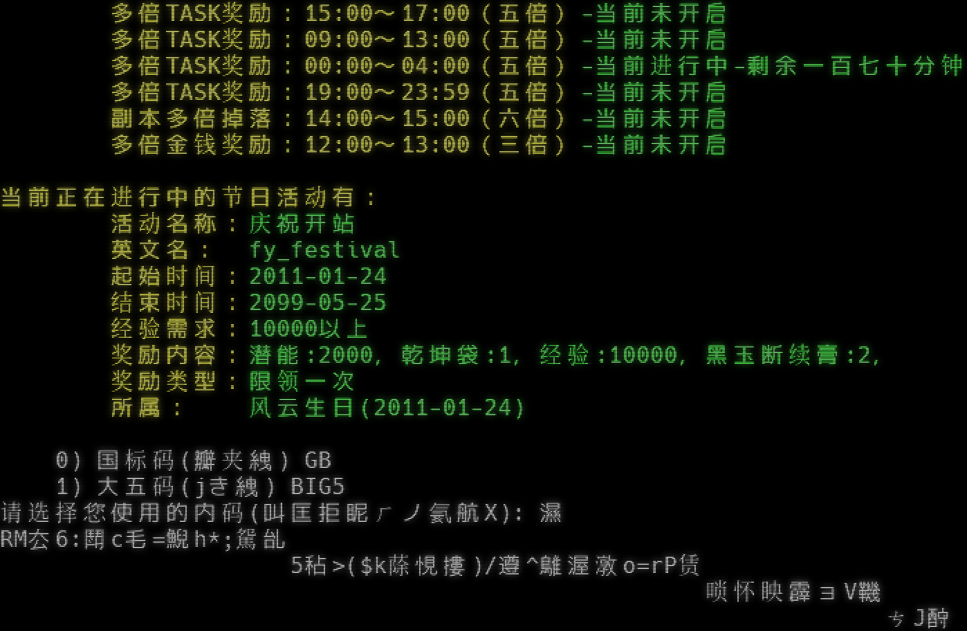 .; , ,,,.;.. ;; . ,,,.;.;..,,;;.; . ,..,,.; . , ;; ,;;.; , .;;.. ,;;;;;;;;;; , ..;; . .;; ,;; . ,,,, .;; . ;;.;,, , ..;;.; ,;;.​..... ,;;,,.;.;.. ,;; , , .;;;;;;;;;;; . ,;; .;;; . ,.; . ,...;.;;;;;.; ,.. ,,,;; .;.; ,,, ,,;;.. ,.; . ,..,,;;;;;;;;;;.;.;;;;; , ..;;;;;;; , ,.; ,;;;;.; , .. ,..;;;;.; ,.; . . ..;;.;.;.;.;;;;; . . .;,,;;.. ...;;;;;.;.;.;;;.; .;.;;;.. ,;;..;; .; . ;;;; . . , ;; . .; ,.; , . ..;; , . .; ,;; . .;.. ,,;;.. ,,,.;.​... ;; .. , .;; .;.; , ,;; , .;,, ,,.; ..;;;;;;;;;;;.. ,.; , .;;.;.; ,,.; .;;;;,, .. , .;,, ..;;; ,;;;;,,.. . . ,,;;.; .;.; ,,,.; ,;;.; ...;;;;; , , , . .​... ,,.. . . 狂 风 一 翻 滚 何 处 不 是 云 重点提示: 1. 降低读书和学习的难度,不再消耗精、神 2. 降低新手难度,huaman的送花任务可以到10w,并增加了奖励 3. 1w经验之后可以去tj n e ask jieri shizhe about reward领取开站奖励。 4. 请认真关注help whatsnew.txt 5. 开放QQ群:77309838 目前风云提供的活动包括: 财神到:19:00~21:00(一倍)-当前未开启 财神到:12:30~14:00(一倍)-当前未开启 多倍金钱奖励:19:30~21:30(六倍)-当前未开启 ZONGZI:08:00~20:00(一倍)-当前未开启 多倍TASK奖励:04:00~07:00(五倍)-当前未开启 多倍TASK奖励:15:00~17:00(五倍)-当前未开启 多倍TASK奖励:09:00~13:00(五倍)-当前未开启 多倍TASK奖励:00:00~04:00(五倍)-当前进行中-剩余一百七十分钟 多倍TASK奖励:19:00~23:59(五倍)-当前未开启 副本多倍掉落:14:00~15:00(六倍)-当前未开启 多倍金钱奖励:12:00~13:00(三倍)-当前未开启 当前正在进行中的节日活动有: 活动名称:庆祝开站 英文名: fy_festival 起始时间:2011-01-24 结束时间:2099-05-25 经验需求:10000以上 奖励内容:潜能:2000,乾坤袋:1,经验:10000,黑玉断续膏:2, 奖励类型:限领一次 所属: 风云生日(2011-01-24) 0) 国标码(瓣夹絏) GB 1) 大五码(jき絏) BIG5 请选择您使用的内码(叫匡拒眤ㄏノ氦航X): 濕RM厺6:鬦c毛=鯢h\*;駌乨 5秥>($k蒢悓摟)/遵^鵻渥潡o=rP赁 唢怀眏霹ョV鞿 ㄘJ酧