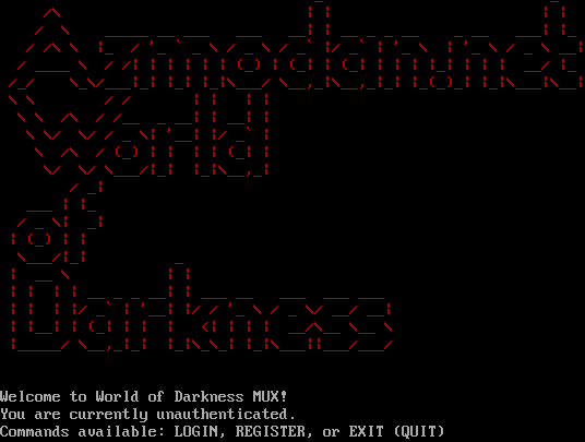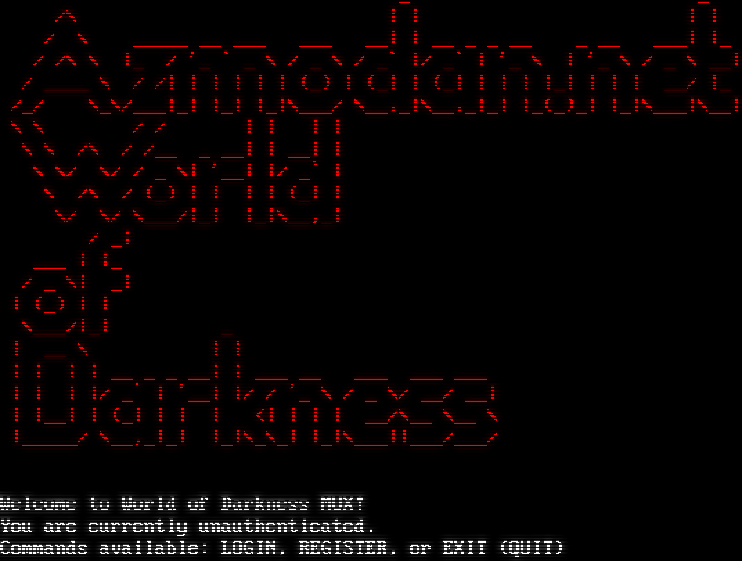 _ _ /\\ \| \| \| \| / \\ _​____ __ ___ ___ __\| \| __ _ _ __ _ __ ___\| \|_ / /\\ \\ \|_ / '_ \` _ \\ / _ \\ / _\` \|/ _\` \| '_ \\ \| '_ \\ / _ \\ __\| / _​___ \\ / /\| \| \| \| \| \| (_) \| (_\| \| (_\| \| \| \| \|_\| \| \| \| __/ \|_ /_/ \\_\\/___\|_\| \|_\| \|_\|\\___/ \\__,_\|\\__,_\|_\| \|_(_)_\| \|_\|\\___\|\\__\| \\ \\ / / \| \| \| \| \\ \\ /\\ / /__ _ __\| \| __\| \| \\ \\/ \\/ / _ \\\| '__\| \|/ _\` \| \\ /\\ / (_) \| \| \| \| (_\| \| \\/ \\/ \\___/\|_\| \|_\|\\__,_\| / _\| ___ \| \|_ / _ \\\| _\| \| (_) \| \| \\___/\|_\| _ \| __ \\ \| \| \| \| \| \| __ _ _ __\| \| ___ __ ___ ___ ___ \| \| \| \|/ _\` \| '__\| \|/ / '_ \\ / _ \\/ __/ __\| \| \|__\| \| (_\| \| \| \| <\| \| \| \| __/\\__ \\__ \\ \|_​____/ \\__,_\|_\| \|_\|\\_\\_\| \|_\|\\___\|\|___/___/ Welcome to World of Darkness MUX! You are currently unauthenticated. Commands available: LOGIN, REGISTER, or EXIT (QUIT)