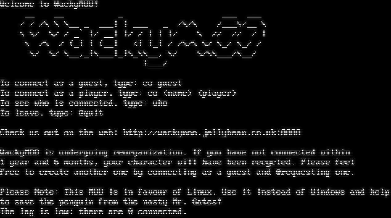 Welcome to WackyMOO! __ __ _ ___ ___ / / /\\ \\ \\__ _ ___\| \| ___ _ /\\/\\ /___\\/__ \\ \\ \\/ \\/ / _\` \|/ __\| \|/ / \| \| \|/ \\ // // / \| \\ /\\ / (_\| \| (__\| <\| \|_\| / /\\/\\ \\/ \\_/ \\_/ / \\/ \\/ \\__,_\|\\___\|_\|\\_\\\\__, \\/ \\/\\\\___/\\__/ \|___/ To connect as a guest, type: co guest To connect as a player, type: co <name> <player> To see who is connected, type: who To leave, type: @quit Check us out on the web: http://wackymoo.jellybean.co.uk:8888 WackyMOO is undergoing reorganization. If you have not connected within 1 year and 6 months, your character will have been recycled. Please feel free to create another one by connecting as a guest and @requesting one. Please Note: This MOO is in favour of Linux. Use it instead of Windows and help to save the penguin from the nasty Mr. Gates! The lag is low; there are 0 connected.
