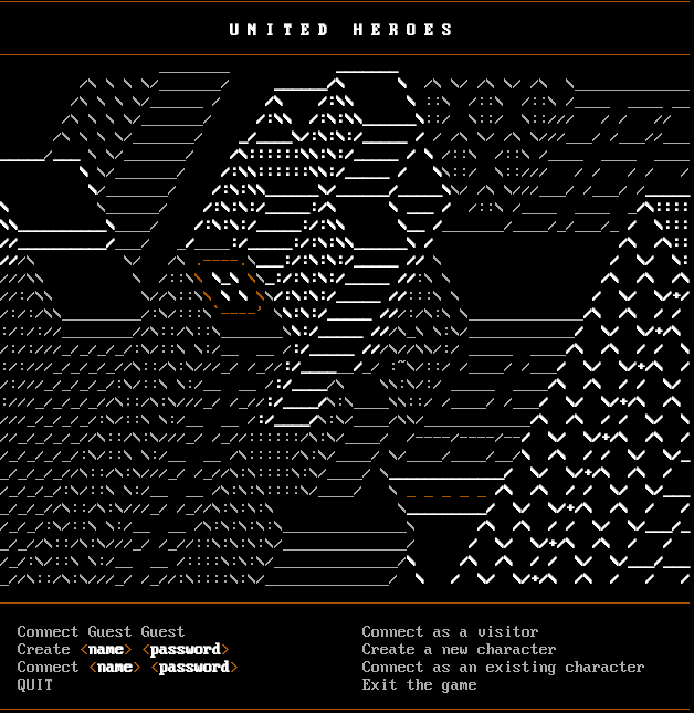 _​_____________________________________________________________________________ U N I T E D H E R O E S _​_____________________________________________________________________________ _​_______ _​______ /\\ \\ \\ \\/_​______/ _​_____/\\ \\ /\\ \\/ /\\ \\/ /\\ \\_​____________ /\\ \\ \\ \\/_​_____ / /\\ /:\\\\ \\ ::\\ /::\\ /::\\ /_​___ _​___ __ /\\ \\ \\ \\/_​______/ /:\\\\ /:\\:\\\\_​_____\\::/ \\::/ \\::/// / / // /\\ \\ \\ \\/_​______/ _/_​___\\/:\\:\\:/_​____ / / /\\ \\/ /\\ \\///___/ /___//___ _​____/___ \\ \\/_​______/ /\\::::::\\\\:\\:/_​____ / \\ /::\\ /::\\ /_​___ _​___ _​___ \\ \\/_​______/ /:\\\\::::::\\\\:/_​____ / \\\\::/ \\::/// / / / / / \\/_​______/ /:\\:\\\\_​_____\\/_​_____/_​____\\\\/ /\\ \\///___/ /___/ /_​____ \\ \\_​_____/ /:\\:\\:/_​____:/\\ \\ ___ / /::\\ /_​___ _​___ _/\\:::: \\\\_​_________\\_​___/ /:\\:\\:/_​____:/:\\\\ \\__ /_​______/_​___/_/___/_ / \\::: //_​_________/___/ _/_​___:/_​____:/:\\:\\\\_​_____\\ / /\\ /\\:: ///\\ \\/ /\\ .​----.\\___:/:\\:\\:/_​____ // \\ / \\/ \\: ///\\\\ \\ /::\\\\ \\_\\ \\\\_:/:\\:\\:/_​____ //:\\ \\ /\\ /\\ /\\ //:/\\\\ \\//\\::\\\\ \\ \\ \\\\/:\\:\\:/_​____ //:::\\ \\ / \\/ \\/+/ /:/:/\\\\_​________/:\\/:::\\\`-​---' \\\\:\\:/_​____ ///:/\\:\\ \\_​____________/\\ /\\ / / :/:/://_​_______//\\::/\\::\\_​______\\\\:/_​____ ///\\_\\ \\:\\/_​___________/ \\/ \\/+/\\ /:/:///_/_/_/_/:\\/::\\ \\:/__ __ /:/_​____ ///\\//\\\\/:/ _​____ _​___/\\ /\\ / / \\ :/:///_/_/_/_//\\::/\\:\\///_/ /_//:/_​_____/_/ :~\\/::/ /_​___/ /___/ \\/ \\/+/\\ / /:///_/_/_/_/:\\/::\\ \\:/__ __ /:/_​___/\\ \\\\:\\/:/ _​____ _​___/\\ /\\ / / \\/ :///_/_/_/_//\\::/\\:\\///_/ /_//:/_​___/\\:\\_​___\\\\::/ /_​___/ /___/ \\/ \\/+/\\ /\\ ///_/_/_/_/:\\/::\\ \\:/__ __ /:/_​___/\\:\\/_​___/\\\\/_​___________/\\ /\\ / / \\/ \\ //_/_/_/_//\\::/\\:\\///_/ /_//::::::/\\:\\/_​___/ /-​---/-​---/--/ \\/ \\/+/\\ /\\ / /_/_/_/_/:\\/::\\ \\:/__ __ /\\:::::/\\:\\/_​___/ \\/_​___/_​___/__/\\ /\\ / / \\/ \\/_ _/_/_/_//\\::/\\:\\///_/ /_//\\:\\::::\\:\\/_​___/ \\_​____________/ \\/ \\/+/\\ /\\ / /_/_/_/:\\/::\\ \\:/__ __ /\\:\\:\\::::\\/_​___/ \\ _ _ _ _ _ /\\ /\\ / / \\/ \\/___ _/_/_//\\::/\\:\\///_/ /_//\\:\\:\\:\\ \\_​________/ \\/ \\/+/\\ /\\ / / /_/_/:\\/::\\ \\:/__ __ /\\:\\:\\:\\:\\_​_____________\\ /\\ /\\ / / \\/ \\/___/_ _/_//\\::/\\:\\///_/ /_//::\\:\\:\\:\\/_​_____________/ / \\/ \\/+/\\ /\\ / / /_/:\\/::\\ \\:/__ __ /::::\\:\\:\\/_​_____________/\\ /\\ /\\ / / \\/ \\/___/___ _//\\::/\\:\\///_/ /_//:\\::::\\:\\/_​_____________/ \\ / \\/ \\/+/\\ /\\ / / / _​_____________________________________________________________________________ Connect Guest Guest Connect as a visitor Create <name> <password> Create a new character Connect <name> <password> Connect as an existing character QUIT Exit the game _​____________________________________________________________________________\_