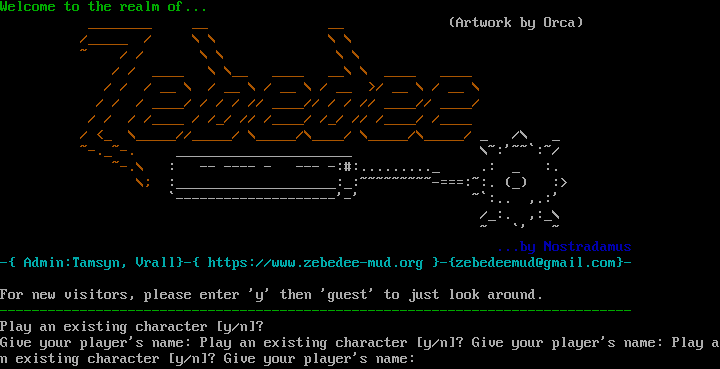 Welcome to the realm of... _​_______ __ __ (Artwork by Orca) /_​____ / \\ \\ \\ \\ ~ / / \\ \\ \\ \\ / / _​___ \\ \\__ _​___ __\\ \\ _​___ _​___ / / / __ \\ / __ \\ / __ \\ / __ >/ __ \\ / __ \\ / / / _​___/ / / / // _​___// / / // _​___// _​___/ / / / /_​___ / /_/ // /_​___/ /_/ // /_​___/ /_​___ / <_ \\_​____//_​____/ \\_​____/\\_​___/ \\_​____/\\_​____/ _ /\\ _ ~​-._~-. _​_____________________ \\~:'~~\`:~/ ~-.\\ : -- -​--- - --- -:#:.​........_ .: _ :. \\; :_​___________________:_:~​~~~~~~~~-===:~:. (_) :> \`-​-------------------'-' ~\`:.. ,.:' /_:. ,:_\\ ~ \`' ~ ...by Nostradamus -{ Admin:Tamsyn, Vrall}-{ https://www.zebedee-mud.org }-{zebedeemud@gmail.com}- For new visitors, please enter 'y' then 'guest' to just look around. -​------------------------------------------------------------------------------ Play an existing character [y/n]? Give your player's name: Play an existing character [y/n]? Give your player's name: Play an existing character [y/n]? Give your player's name: