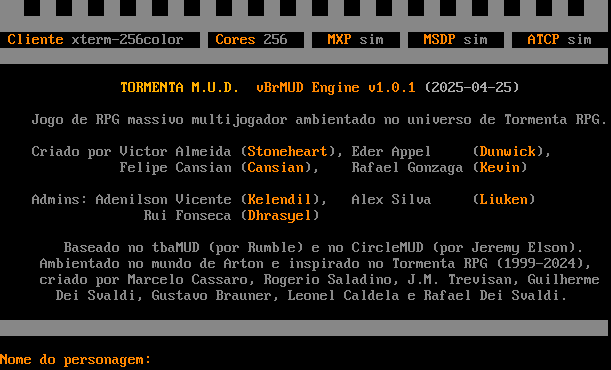 Conectando ao mundo de Tormenta, aguarde.. Cliente xterm-256color Cores 256 MXP sim MSDP sim ATCP sim TORMENTA M.U.D. vBrMUD Engine v1.0.1 (2025-04-25) Jogo de RPG massivo multijogador ambientado no universo de Tormenta RPG. Criado por Victor Almeida (Stoneheart), Eder Appel (Dunwick), Felipe Cansian (Cansian), Rafael Gonzaga (Kevin) Admins: Adenilson Vicente (Kelendil), Alex Silva (Liuken) Rui Fonseca (Dhrasyel) Baseado no tbaMUD (por Rumble) e no CircleMUD (por Jeremy Elson). Ambientado no mundo de Arton e inspirado no Tormenta RPG (1999-2024), criado por Marcelo Cassaro, Rogerio Saladino, J.M. Trevisan, Guilherme Dei Svaldi, Gustavo Brauner, Leonel Caldela e Rafael Dei Svaldi. Nome do personagem: