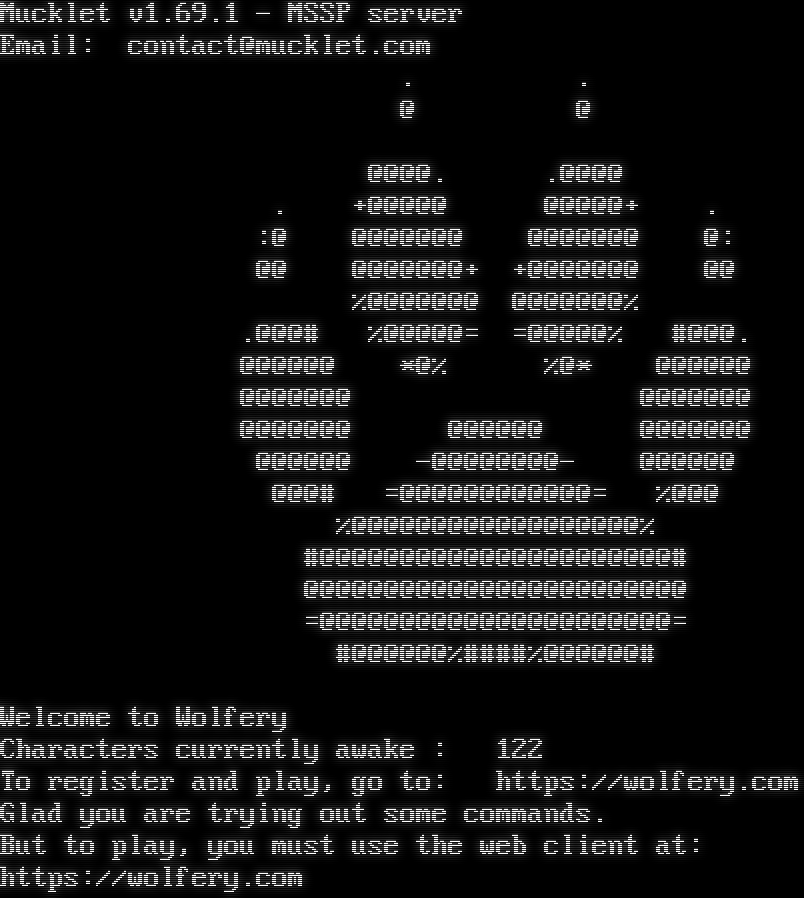 Mucklet v1.69.1 - MSSP server Email: contact@mucklet.com . . @ @ @@@@. .@@@@ . +@@@@@ @@@@@+ . :@ @@@@@@@ @@@@@@@ @: @@ @@@@@@@+ +@@@@@@@ @@ %@@@@@@@ @@@@@@@% .@@@# %@@@@@= =@@@@@% #@@@. @@@@@@ \*@% %@\* @@@@@@ @@@@@@@ @@@@@@@ @@@@@@@ @@@@@@ @@@@@@@ @@@@@@ -@@@@@@@@- @@@@@@ @@@# =@@@@@@@@@@@@= %@@@ %@@@@@@@@@@@@@@@@@@% #@@@@@@@@@@@@@@@@@@@@@@# @@@@@@@@@@@@@@@@@@@@@@@@ =@@@@@@@@@@@@@@@@@@@@@@= #@@@@@@%#​###%@@@@@@# Welcome to Wolfery Characters currently awake : 122 To register and play, go to: https://wolfery.com Glad you are trying out some commands. But to play, you must use the web client at: https://wolfery.com