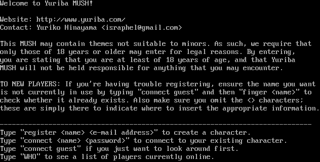 Welcome to Yuriba MUSH! Website: http://www.yuriba.com/ Contact: Yuriko Hinayama <israphel@gmail.com> This MUSH may contain themes not suitable to minors. As such, we require that only those of 18 years or older may enter for legal reasons. By entering, you are stating that you are at least of 18 years of age, and that Yuriba MUSH will not be held responsible for anything that you may encounter. TO NEW PLAYERS: If you're having trouble registering, ensure the name you want is not currently in use by typing "connect guest" and then "finger <name>" to check whether it already exists. Also make sure you omit the <> characters; these are simply there to indicate where to insert the appropriate information. -​---------------------------------------------------------------------------- Type "register <name> <e-mail address>" to create a character. Type "connect <name> <password>" to connect to your existing character. Type "connect guest" if you just want to look around first. Type "WHO" to see a list of players currently online.