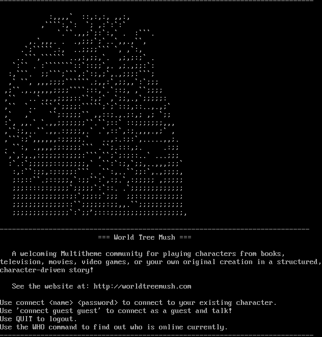 -​---------------------------------------------------------------------------- :,,,,\` ::,:,:, ,,:, ,\`\`\`\`:,\`: \`; ,:\`:\`:\` \`.\`\`.,,;\`;:\`:,\` . :\`\`\`. ,.\`,,,. . .,;;;\`;\`..\`,,.,\`\`, .\`;\`\`\`\`\`.:, ..;;;;\`\`\` \`, ,\`:, ..\`\`\`,\`\`\`\`\`\` ..,:,;;,\`. ,;,;:;\` . \`:\`\` . :\`\`\`\`\`\`\`::\`::;;\`,. ,;.,;;:\`: :,\`\`\`. ;;\`\`\`;\`\`\`,:\`:;,;\`,.,;;;:\`\`\`; ,\` \`\`, ,,,;;;;\`\`\`\`\`\`.;,,:\`,;;,,\`:\`;;; ,;\`\`.,.,,,,,;;;;\`\`\`\`:::,\`.\`::;, ,\`\`;;;; ,\`\` ..\`.,.,;;;;::\`\`:,;\` ,\`;;,.,\`;;;;;: ,\`\` \`.. \`\`\`,\`;;;;:\`\`\`\`\`;\`;\`::;,::..,.,;\` ,\` ,\` \`\`;:;;;;\`\` ,,::;.,.;:,; ,; \`;; :\`, ,,.\` \`.,,;;;;;;;\`\`.\`\`;::\` ::;;;;;;;,,, ,\`\`:;,..\`\`.,,.:;;;;,.\` .\`,::\`,:;.,,,.,;\` , ,\`\`\`:;\`,,,,,,:;;;;;.\` ..,:.:;:\`,.​....,,;. . \`\`:, .,,,,;;:;;;;\`\`\` .\`\`;.:::,;. .:;; \`,\`,:,.,:;;;;;:;;;;:\`\`\`,\`\`;\`;:;::..\` ...;;; :\`.:\`;;;;;;::;;;;;;,\` .\`\`:\`:;,\`;;,..,,,;;;\` :,:\`\`:;;,:;:;;;:\`\`\`. .\`\`:,..\`\`;;:\`,.,;;;;, ;:;::\`\`.;::;;;,\`:;;\`\`:\`,:;.\`,:;;;;; ,;;;;; ;;;::::;:;;;;;\`;;;;;\`:\`::. .\`;;;;;;;;;;;;; ;;;;;;;;;;;;;:;:\`;;;:;\`;;; ;;::;;;;;;;;;; ;;;;;;;;;;;;;::\`\`;;;;;;:;;,,.\`\`;;;;;;;;;;; ;;;;;;;;;;;;;;\`:\`;;';:::;;;;;;;;;;;;;;;;;;, -​--------------------------------------------------------------------------- === World Tree Mush === A welcoming Multitheme community for playing characters from books, television, movies, video games, or your own original creation in a structured, character-driven story! See the website at: http://worldtreemush.com Use connect <name> <password> to connect to your existing character. Use 'connect guest guest' to connect as a guest and talk! Use QUIT to logout. Use the WHO command to find out who is online currently. -​----------------------------------------------------------------------------