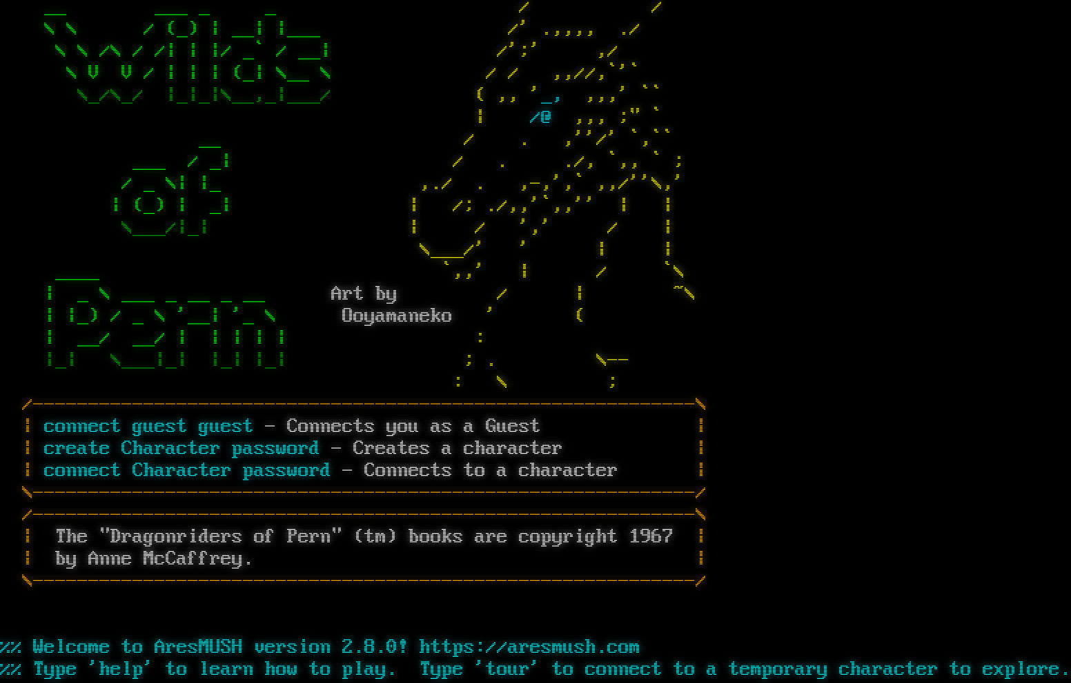 __ ___ _ _ / / \\ \\ / (_) \| __\| \|___ /' .,,,, ./ \\ \\ /\\ / /\| \| \|/ _\` / __\| /';' ,/ \\ V V / \| \| \| (_\| \\__ \\ / / ,,//,\`'\` \\_/\\_/ \|_\|_\|\\__,_\|___/ ( ,, '_, ,,,' \`\` \| /@ ,,, ;" \` __ / . ,''/' \`,\`\` ___ / _\| / . ./, \`,, \` ; / _ \\\| \|_ ,./ . ,-,',\` ,,/''\\,' \| (_) \| _\| \| /; ./,,'\`,,'' \| \| \\___/\|_\| \| / ',' / \| \\___/' ' \| \| _​___ \`,,' \| / \`\\ \| _ \\ ___ _ __ _ __ Art by / \| ~\\ \| \|_) / _ \\ '__\| '_ \\ Ooyamaneko ' ( \| __/ __/ \| \| \| \| \| : \|_\| \\___\|_\| \|_\| \|_\| ; . \\-- : \\ ; /-​-----------------------------------------------------------\\ \| connect guest guest - Connects you as a Guest \| \| create Character password - Creates a character \| \| connect Character password - Connects to a character \| \\-​-----------------------------------------------------------/ /-​-----------------------------------------------------------\\ \| The "Dragonriders of Pern" (tm) books are copyright 1967 \| \| by Anne McCaffrey. \| \\-​-----------------------------------------------------------/ %% Welcome to AresMUSH version 2.8.0! https://aresmush.com %% Type 'help' to learn how to play. Type 'tour' to connect to a temporary character to explore.