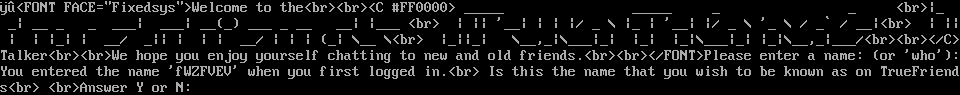 &#255;&#251;<FONT FACE="Fixedsys">Welcome to the<br><br><C #FF0000> _​____ _​____ _ _ <br>\|_ _\| __ _ _ ___\| ___\| __(_) ___ _ __ __\| \|___ <br> \| \|\| '__\| \| \| \|/ _ \\ \|_ \| '__\| \|/ _ \\ '_ \\ / _\` / __\|<br> \| \|\| \| \| \|_\| \| __/ _\|\| \| \| \| __/ \| \| \| (_\| \\__ \\<br> \|_\|\|_\| \\__,_\|\\___\|_\| \|_\| \|_\|\\___\|_\| \|_\|\\__,_\|___/<br><br></C>Talker<br><br>We hope you enjoy yourself chatting to new and old friends.<br><br></FONT>Please enter a name: (or 'who'): You entered the name 'fWZFVEV' when you first logged in.<br> Is this the name that you wish to be known as on TrueFriends<br> <br>Answer Y or N:
