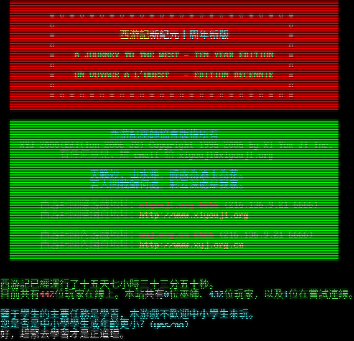 @ @ @ @ @ @ @ @@ @@ @@ @@@@@@@@ @@@@@@@@@@@@@@@ @@ @ @@@@@ @@ @@ @@ @@ @ @@@@@@@ @ @@ @@ @@ @@ @ @ @ @@ @ @@ @@ @ @ @ @ @@@@@ @@@@@ @@ @@@@@@@@@@@@@@ @@ @ @ @ @@ @@ @@@@@@@ @@ @@ @@ @@ @ @ @@@@@ @@ @@ @@ @ @@ @@ @@ @@ @ @ @@ @ @@ @@ @@ @@ @@@@@@ @ @ @@ @@ @@ @@ @@ @@ @@@@@ @@@ @ @@@@@@@@ @@ @@ @@@ @@ @@ @ @@ @@ @@ @@@ @@ @@ @@ @@ @@ @@ @@@ @@ @ @@@@@@@@@@@@@ @@ @ @@ @@ @@@ @@ @ @@ @@ @@ @ @@@ @@@ @ @@@@@@@@@ @ @ @ @ @ @ @@@@@@@ 昹蚔暮辣茩蠟懂溼ㄐ妏蚚弊梓鎢腔俙模③瑩諴gb 西游記歡迎您來訪!使用大五碼的玩家請鍵入:big5 [If there is no response after ENTER, please try Ctrl-ENTER] [枑尨ㄩ蝜偌ENTER瑩綴炵苀羶衄砒茼ㄛ③彸 Ctrl-ENTER] Welcome to Xi You Ji! Select GB or BIG5 (gb/big5): ●○●○●○●○●○●○●○●○●○●○●○●○● ○ ○ ● 西游記新紀元十周年新版 ● ○ ○ ● A JOURNEY TO THE WEST - TEN YEAR EDITION ● ○ ○ ● UN VOYAGE A L'OUEST - EDITION DECENNIE ● ○ ○ ●○●○●○●○●○●○●○●○●○●○●○●○● 西游記巫師協會版權所有 XYJ-2000(Edition 2006-JS) Copyright 1996-2006 by Xi You Ji Inc. 有任何意見,請 email 給 xiyouji@xiyouji.org 天籟妙,山水雅,醉露為酒玉為花。 若人問我歸何處,彩云深處是我家。 西游記國際游戲地址:xiyouji.org 6666 (216.136.9.21 6666) 西游記國際網頁地址:http://www.xiyouji.org 西游記國內游戲地址:xyj.org.cn 6666 (216.136.9.21 6666) 西游記國內網頁地址:http://www.xyj.org.cn 西游記已經運行了十五天七小時三十三分五十秒。 目前共有442位玩家在線上。本站共有0位巫師、432位玩家,以及1位在嘗試連線。 鑒于學生的主要任務是學習,本游戲不歡迎中小學生來玩。 您是否是中小學學生或年齡更小?(yes/no) 好,趕緊去學習才是正道理。