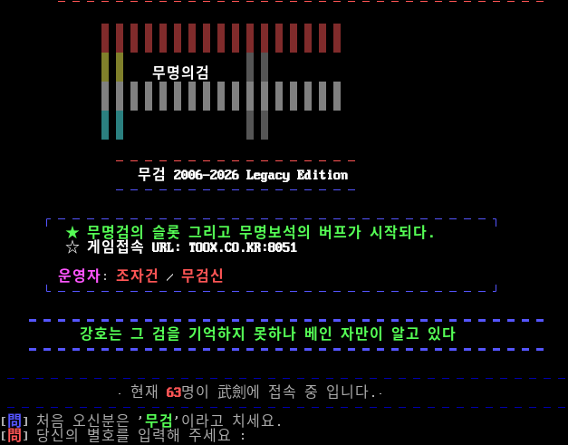────────────────────────────────── ▒▒▒▒▒▒▒▒▒▒▒▒▒▒▒▒▒ ▒▒▒▒▒▒▒▒▒▒▒▒▒▒▒▒▒ ▒▒ ▒▒ ▒▒ 무명의검 ▒▒ ▒▒▒▒▒▒▒▒▒▒▒▒▒▒▒▒▒ ▒▒▒▒▒▒▒▒▒▒▒▒▒▒▒▒▒ ▒▒ ▒▒ ▒▒ ▒▒ ───────────────── 무검 2006-2026 Legacy Edition ───────────────── ┌──────────────────────────────┐ ★ 무명검의 슬롯 그리고 무명보석의 버프가 시작되다. ☆ 게임접속 URL: TOOX.CO.KR:8051 운영자: 조자건 / 무검신 └──────────────────────────────┘ ━━━━━━━━━━━━━━━━━━━━━━━━━━━━━━━━━━━━ 강호는 그 검을 기억하지 못하나 베인 자만이 알고 있다 ━━━━━━━━━━━━━━━━━━━━━━━━━━━━━━━━━━━━ ─────────────────────────────────────── ·현재 63명이 武劍에 접속 중 입니다.· ─────────────────────────────────────── [問] 처음 오신분은 '무검'이라고 치세요. [問] 당신의 별호를 입력해 주세요 :