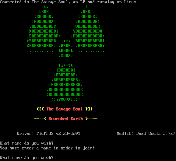 Connected to The Savage Soul, an LP mud running on Linux. .t; ;t. tRBR. ;RBRt :RBBBBR. :RBBBBR: :RBBBBBBX .RBBBBBBR: .RBBBBBBBBY VBBBBBBBBR. XBBBBBBBBBBi YBBBBBBBBBBX ;BBBBBBBBBBBR: ;RBBBBBBBBBBB; tBBBBBBBBBBR. :+=: .RBBBBBBBBBBi XBBBBBBBBBB; ;BBBR; ;BBBBBBBBBBY ::::::::::: tBBBBt ::::::::::: .XBBX. tI++tt iBBBBBBi ;BBBBBBBB; ;RBBBBBBBBR; :RBBBBBBBBBBR: .RBBBBBBBBBBBBR. ;RBBBBBBBBBBBBR; :;iYXVVXIt;: --([{ The Savage Soul }])-- -​-==< Scorched Earth >=​=-- Driver: FluffOS v2.23-ds01 Mudlib: Dead Souls 3.7a7 What name do you wish? You must enter a name in order to join! What name do you wish?