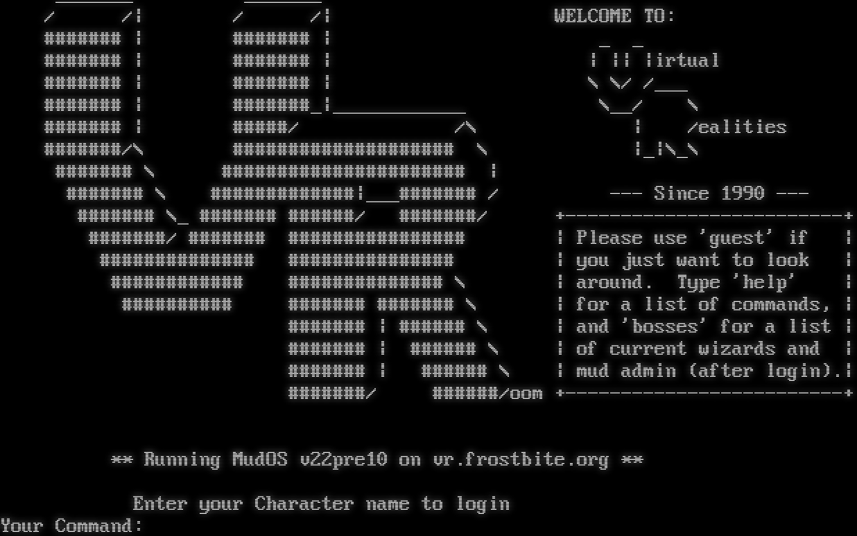_​______ _​______ / /\| / /\| WELCOME TO: #​###### \| #​###### \| _ _ #​###### \| #​###### \| \| \|\| \|irtual #​###### \| #​###### \| \\ \\/ /___ #​###### \| #​######_\|_​___________ \\__/ \\ #​###### \| #​####/ /\\ \| /ealities #​######/\\ #​################### \\ \|_\|\\_\\ #​###### \\ #​##################### \| #​###### \\ #​############\|_​__####### / --- Since 1990 --- #​###### \\_ #​###### #​#####/ #​######/ +​-------------------------+ #​######/ #​###### #​############### \| Please use 'guest' if \| #​############# #​############## \| you just want to look \| #​########### #​############# \\ \| around. Type 'help' \| #​######### #​###### #​###### \\ \| for a list of commands, \| #​###### \| #​##### \\ \| and 'bosses' for a list \| #​###### \| #​##### \\ \| of current wizards and \| #​###### \| #​##### \\ \| mud admin (after login).\| #​######/ #​#####/oom +​-------------------------+ \*\* Running MudOS v22pre10 on vr.frostbite.org \*\* Enter your Character name to login Your Command: