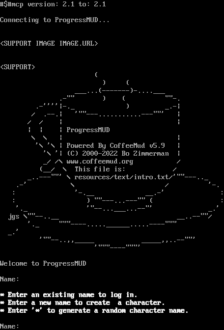 "banner_before_return": "\n\r#$#mcp version: 2.1 to: 2.1\n\r\n\rConnecting to ProgressMUD...\n\r\n\u001b[6z\n\u001b[6z<SUPPORT IMAGE IMAGE.URL>\n\n\u001b[6z\n\u001b[6z<SUPPORT>\n (\n\r ) (\n\r ___...(-------)-....___\n\r .-"" ) ( ""-.\n\r .-''''|-._ ) _.-|\n\r / .--.| '""---...........---""' |\n\r / / | |\n\r | | | ProgressMUD\n\r \\ \\ | |\n\r '\\ '\\ | Powered By CoffeeMud v5.9 |\n\r '\\ '| (C) 2000-2022 Bo Zimmerman |\n\r _/ /\\ www.coffeemud.org /\n\r (__/ \\ This file is: /\n\r _..---""' \\ resources/text/intro.txt/'""---.._\n\r .-' \\ / '-.\n\r : '-.__ __.-' :\n\r : ) ""---...---"" ( :\n\r '._ '"--...___...--"' _.'\n\r jgs \\""--..__ __..--""/\n\r '._ """----.....______.....----""" \r\n _.'\n\r '""--..,,_____ _____,,..--""'\n\r '"""----"""'\n\r\n\rWelcome to ProgressMUD\n\r\n\rName: ",